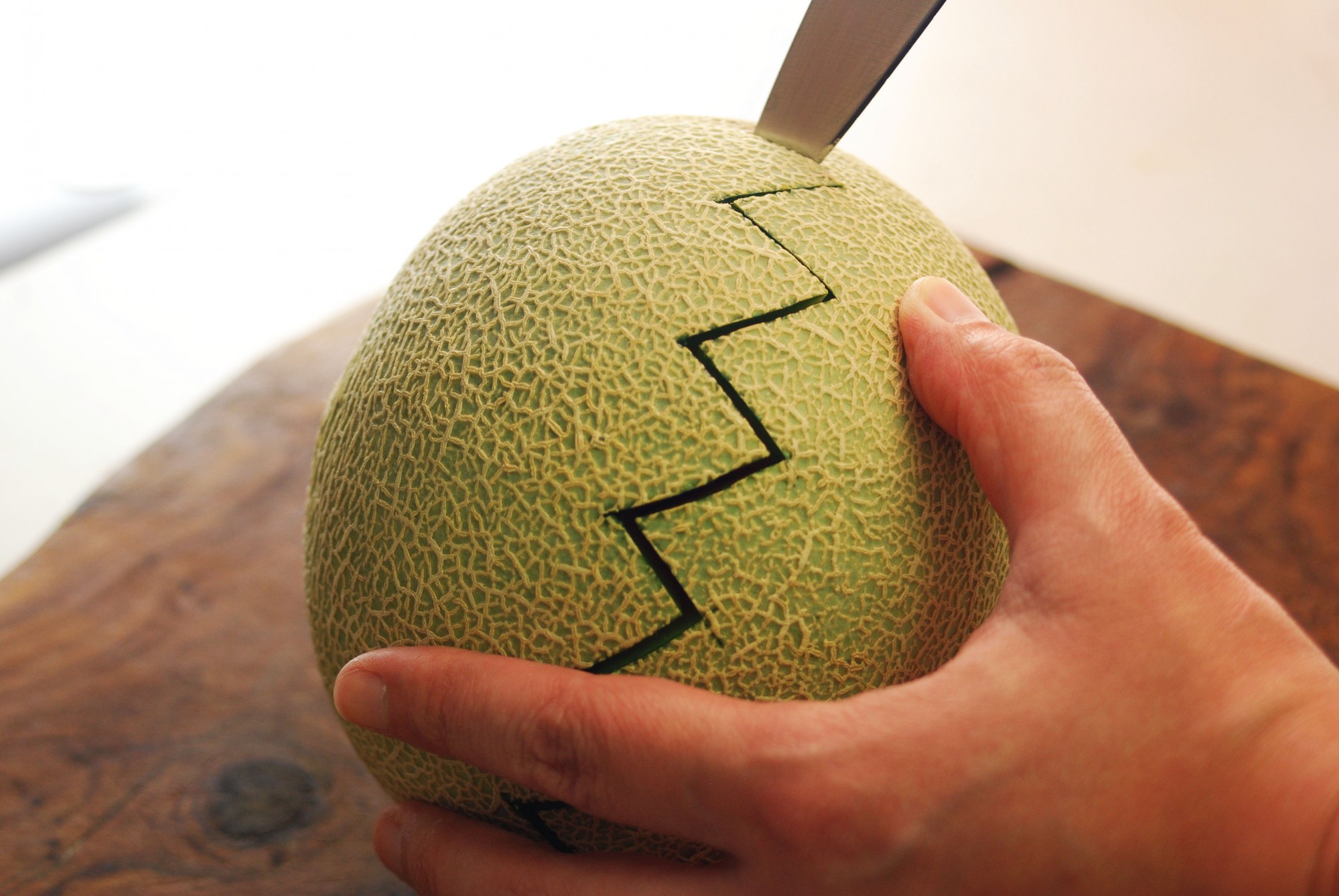 次は少し慎重に作業したいポイントです。種をきれいに取り除いたら、ナイフで果肉に切れ目を入れます。ダイスの形になるように、碁盤の目状に切れ目を入れていきます。最初にメロンのふちに沿って切れ目を入れておきましょう。