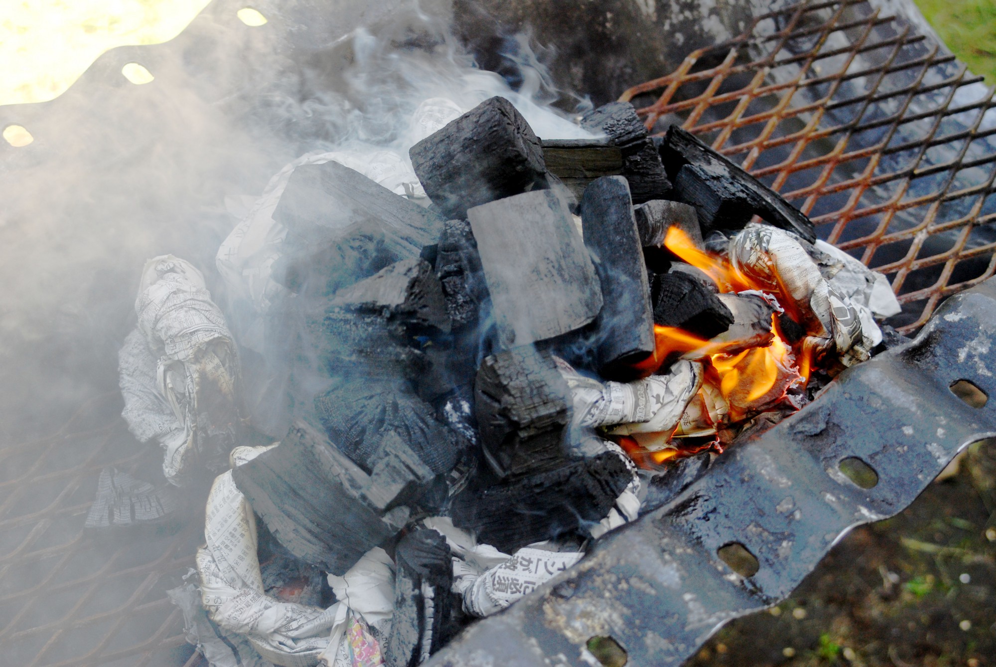 この新聞紙の上に着火剤や木炭などを積んで火をつけます。着火の際は一番下に敷いた新聞紙に火をつけることで、全体にムラなく効率的に火をつけることができます。
