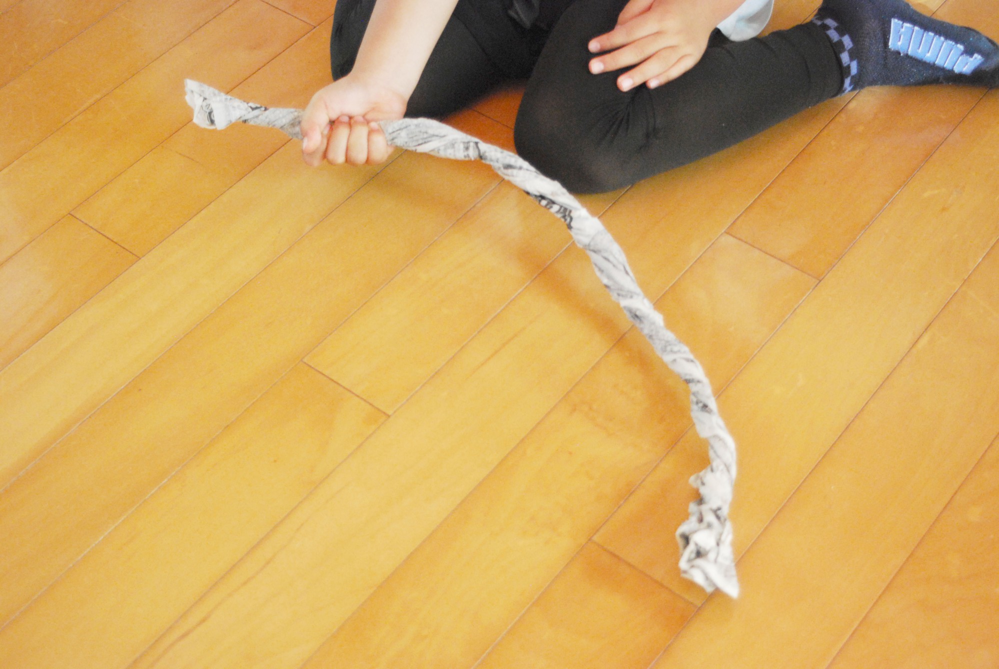 まずは写真のように、新聞紙を棒状に丸めていきます。折りたたみながら丸めてもいいですし、くしゃくしゃにしながら丸めても大丈夫です。お子さんのやりやすい方法で行ってくださいね。