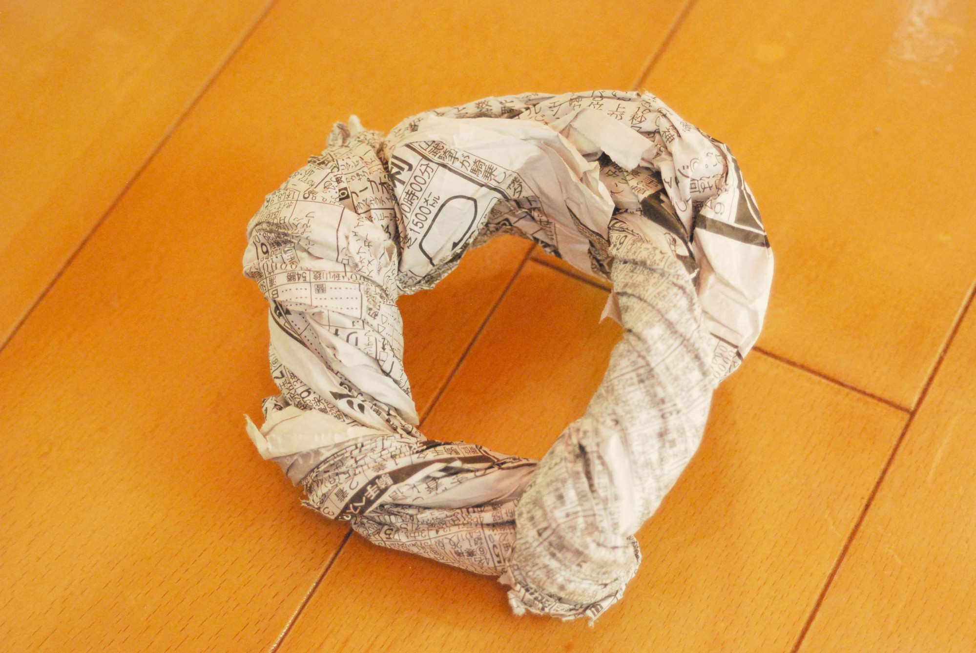 新聞紙全体を強くねじったら、硬い棒状になるはずです。そうしたら次は写真のように、棒を輪っかにしていきます。