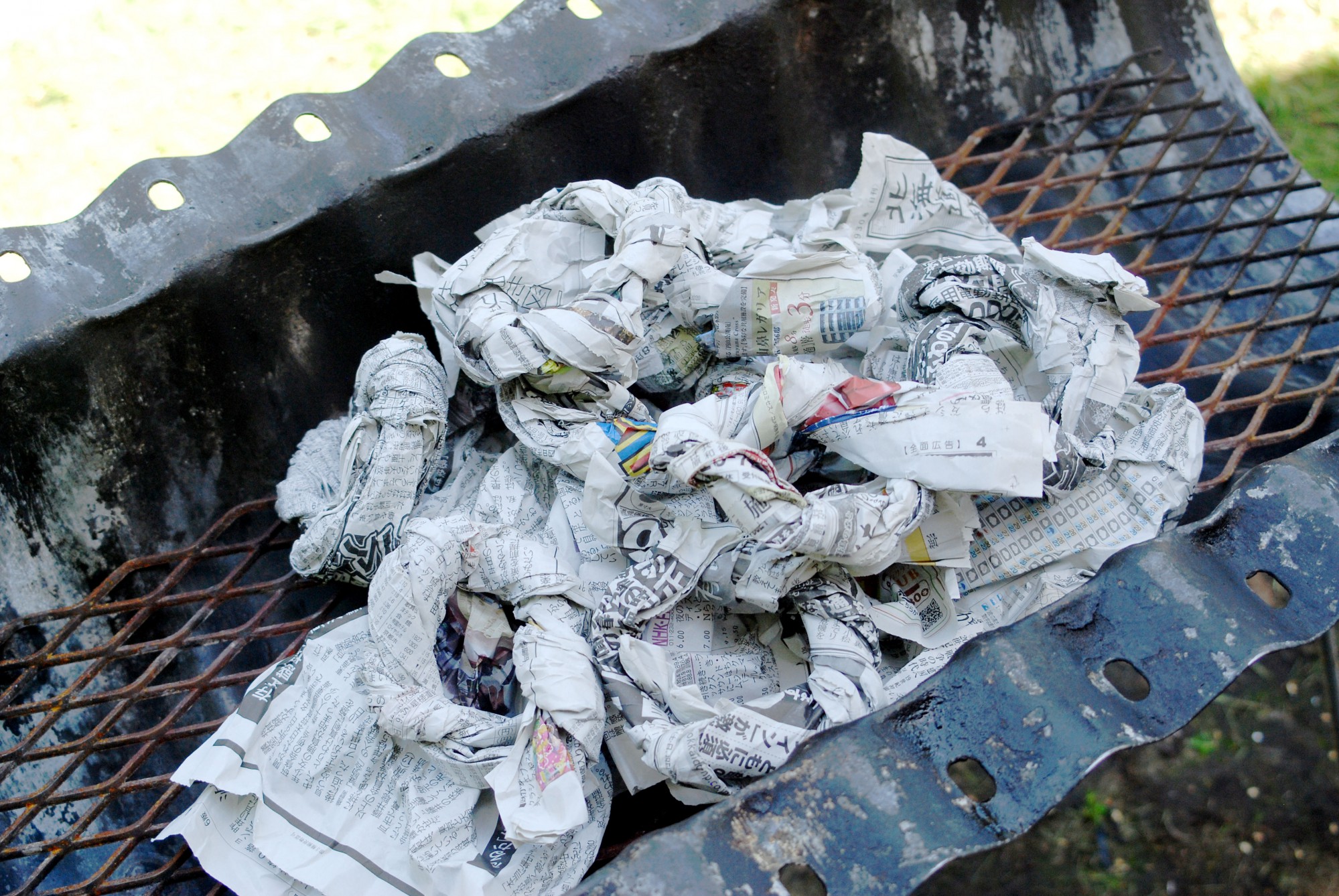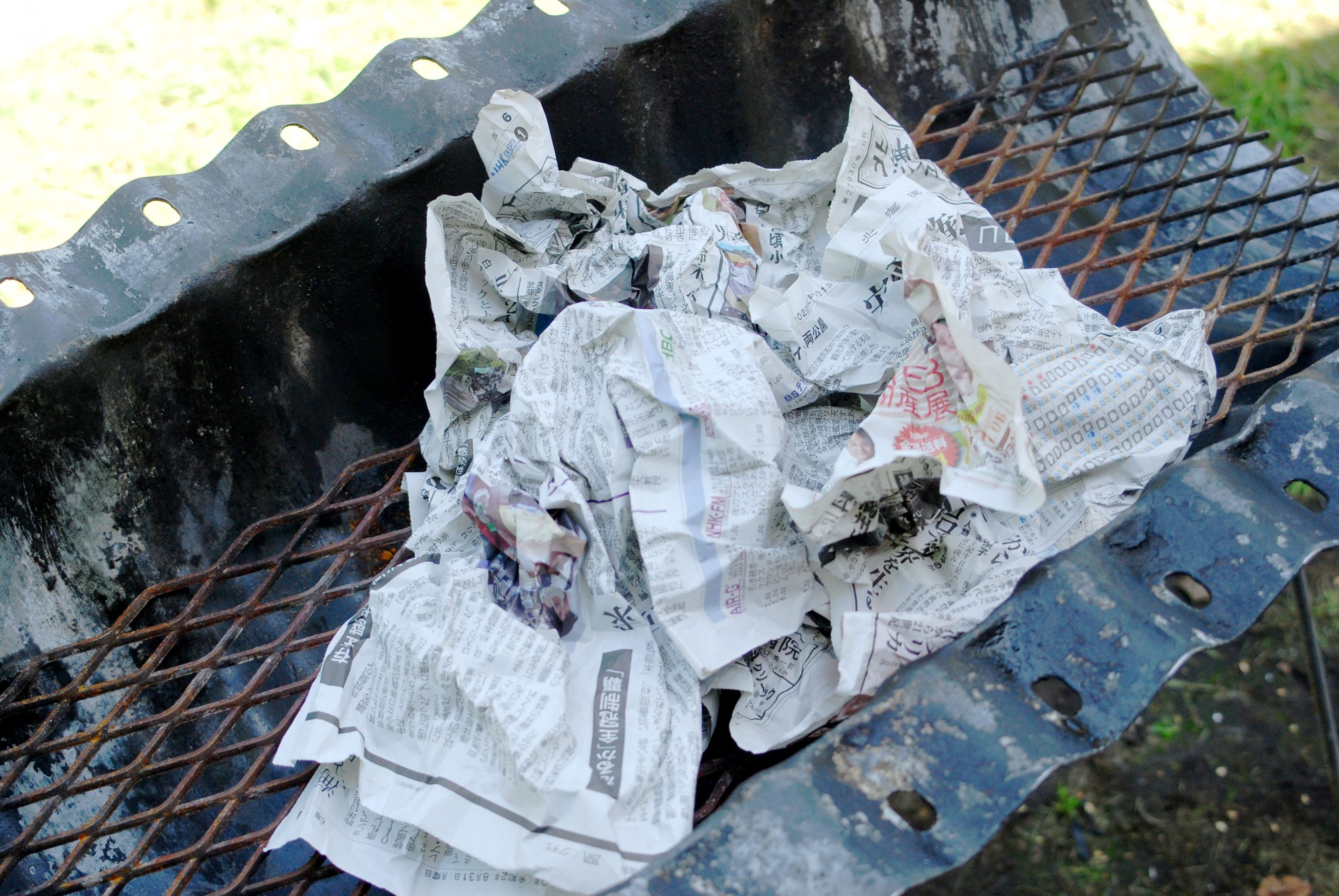 新聞紙をくしゃくしゃにするのは、上に乗せた着火剤や木炭が安定しやすいからです。
