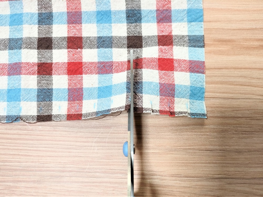 裂いたときに布が丸まってしまうので、手で平らに伸ばし、長めに飛び出ている糸をハサミでカットします。