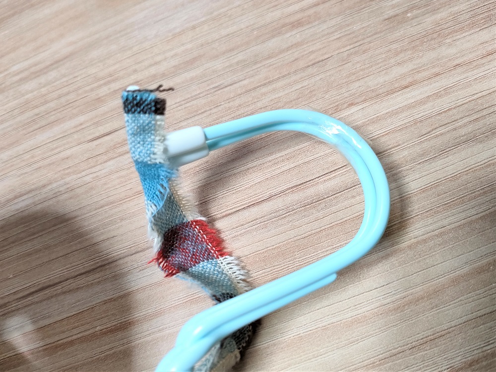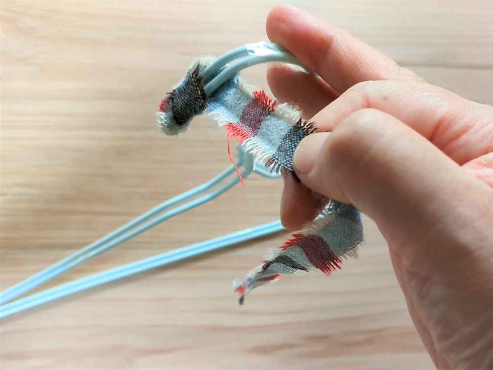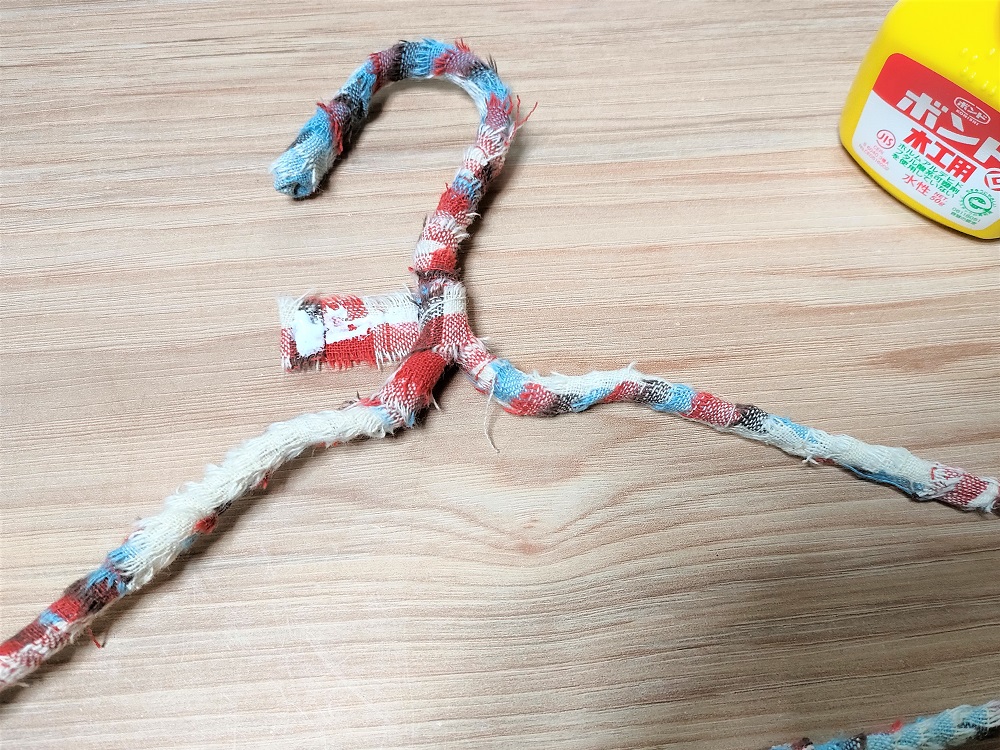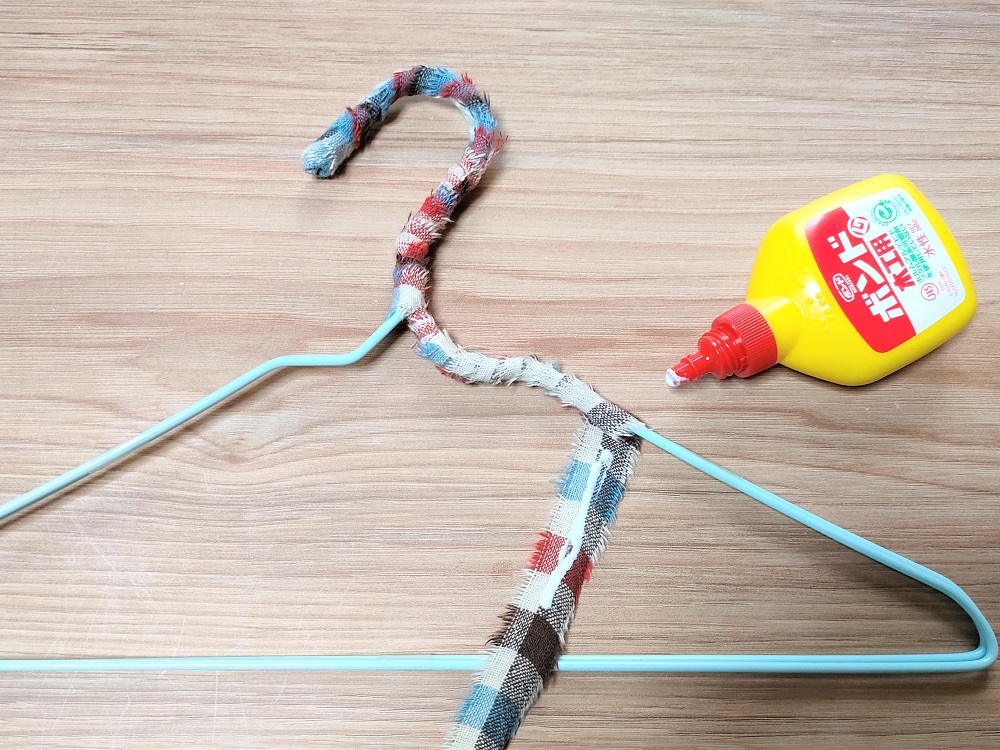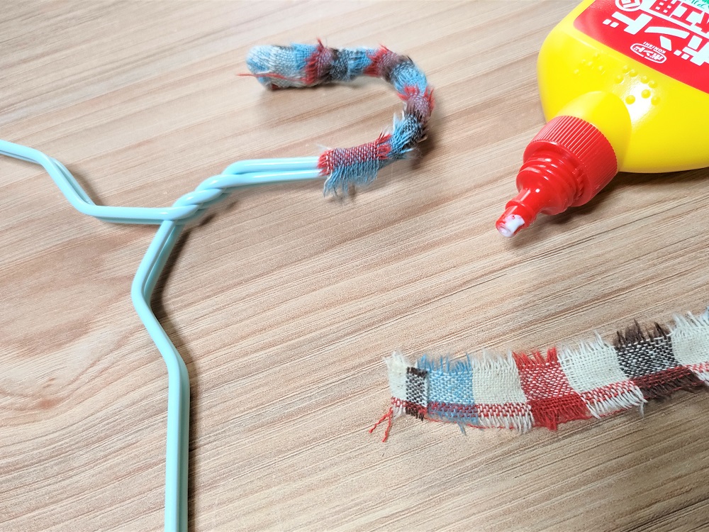 針金ハンガーのフック部分の先端から裂き布リボンを巻いていきます。まず布にボンドを塗り、縦に二つ折りにしてフックの先端を挟み込むようにしましょう。