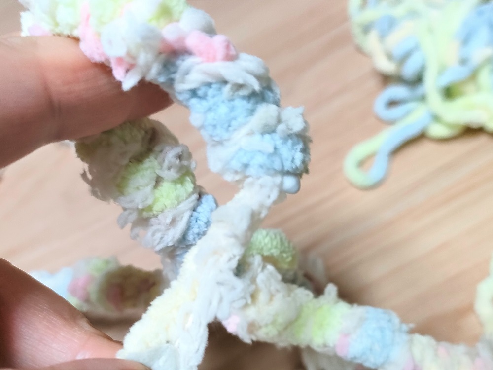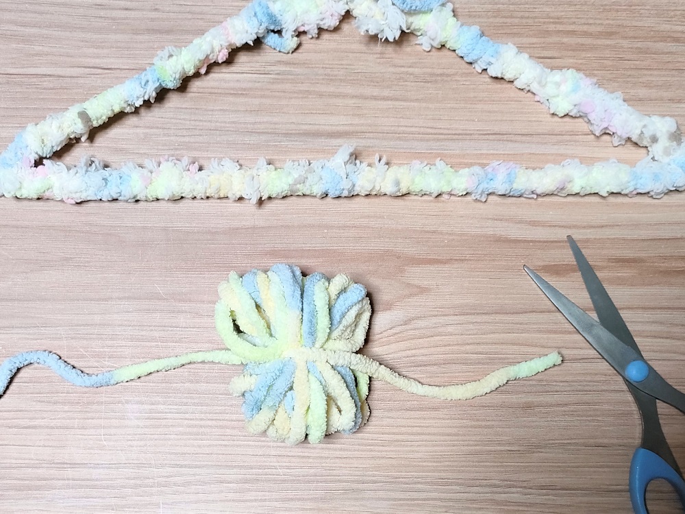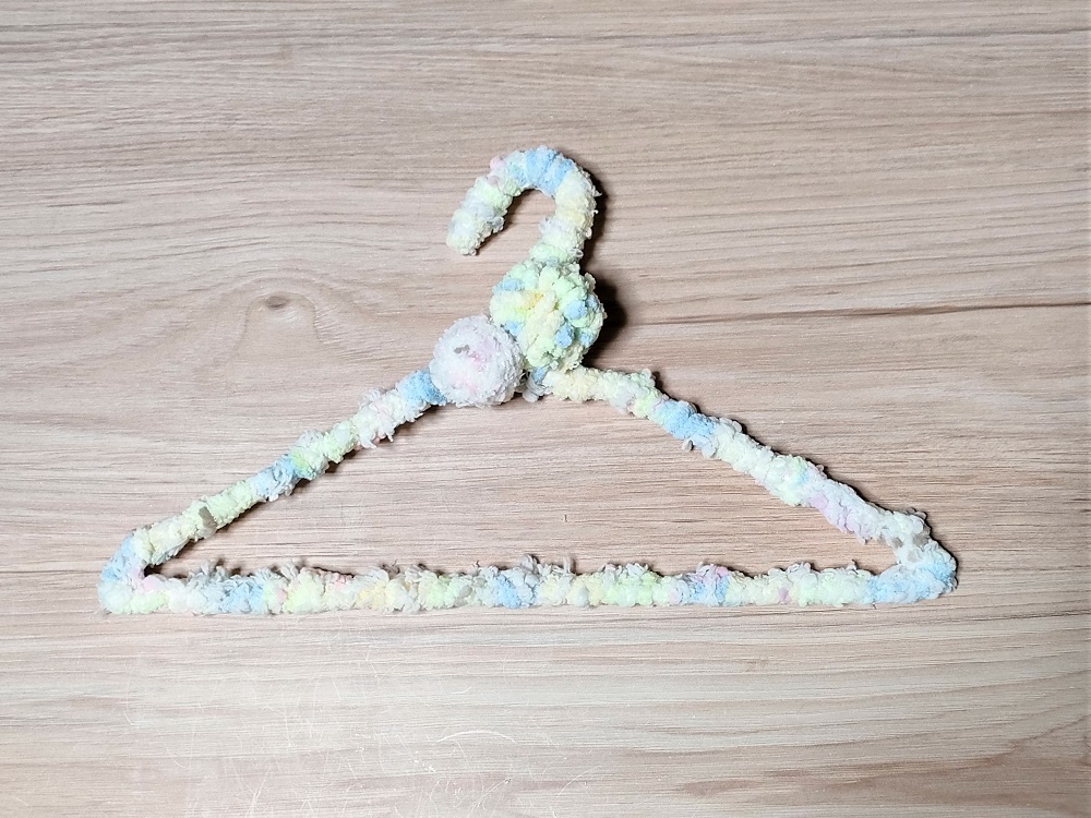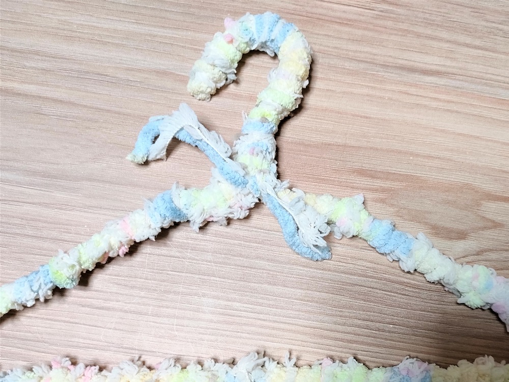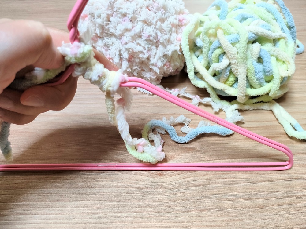 ただ、細い毛糸ほど作業の手間はかかります。ある程度もこもこして太い毛糸の方が、作業がはかどり、完成したハンガーの弾力性もよくなります。
