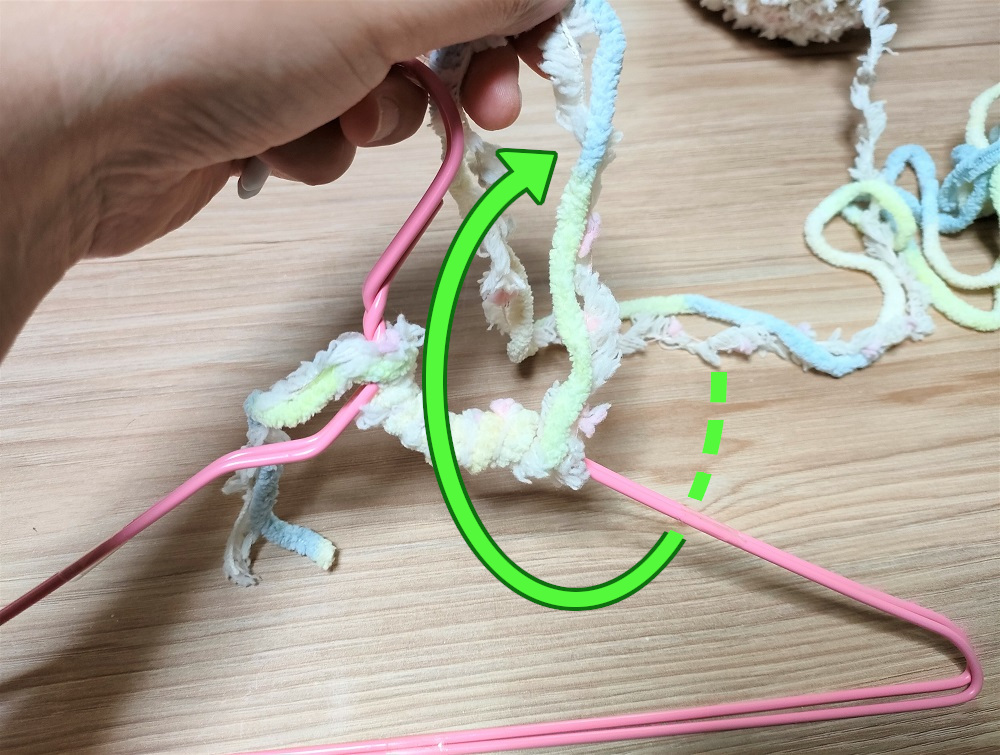 5cm巻くごとに毛糸をハンガーに結び付けるようにします。写真のように毛糸で輪を作っておき、ハンガーの内側にくぐらせたあと更に輪のなかに通して引っ張ると結べます。