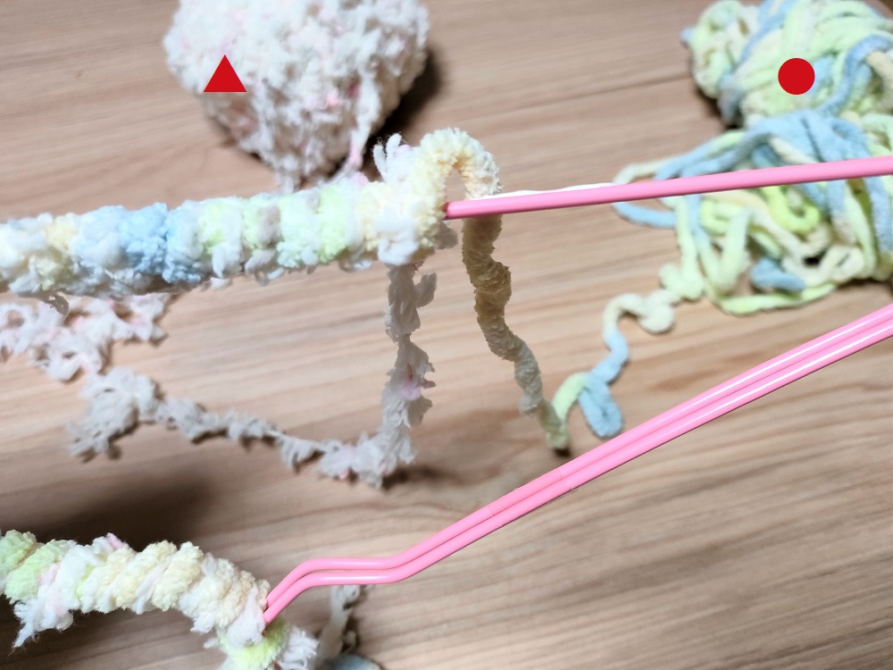 毛糸を2種類使う場合は、●は右、▲は左というふうに、巻き付けたあとに置く位置を決めておくと絡まりにくいですよ。