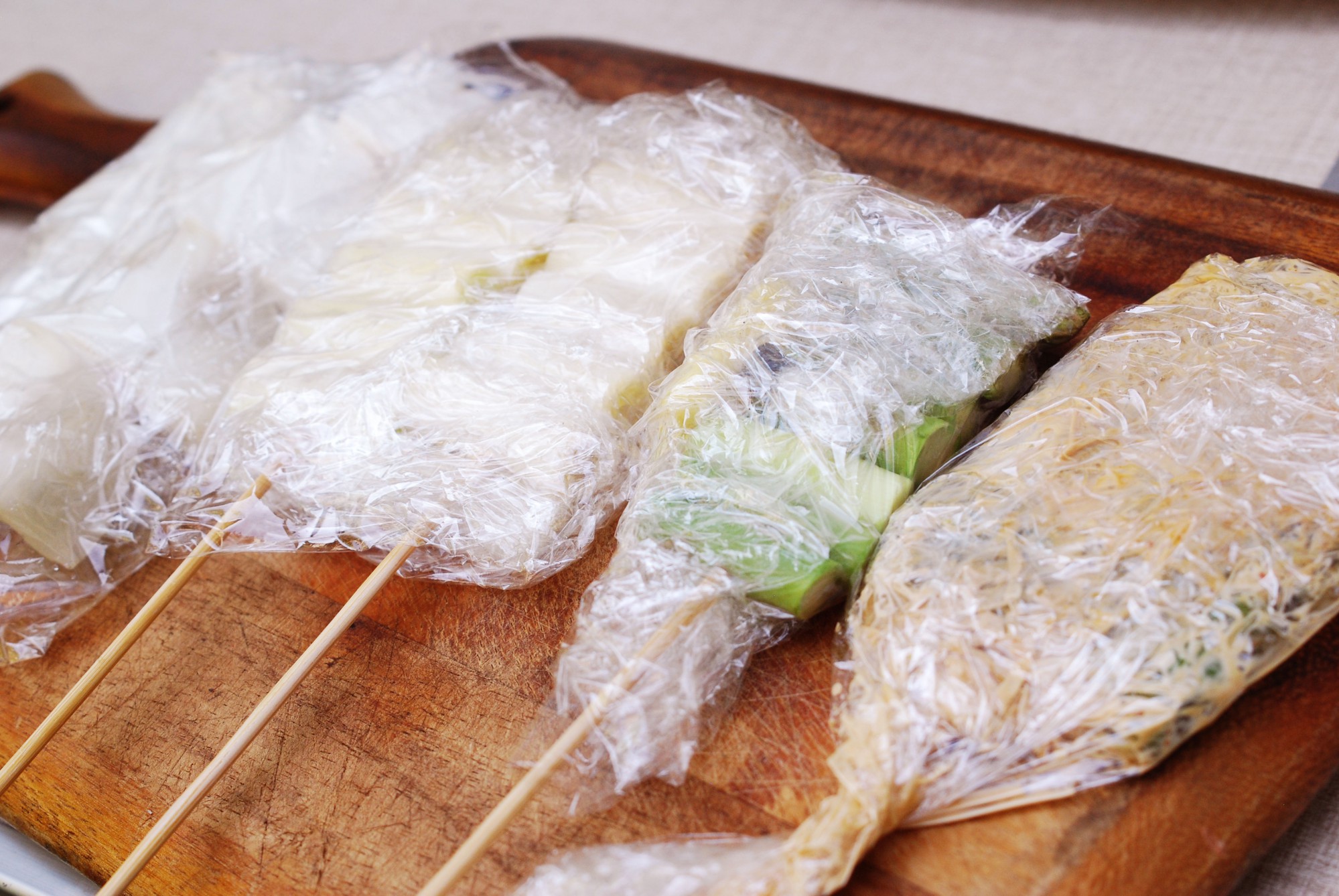 野菜部分のみラップで包んでから、串全体をさらにラップで包むといった具合に、二重で包んでおけば液だれなどの心配もありません。最後にラップで包んだ串野菜を、チャック付きの保存袋などに入れれば完璧です。
