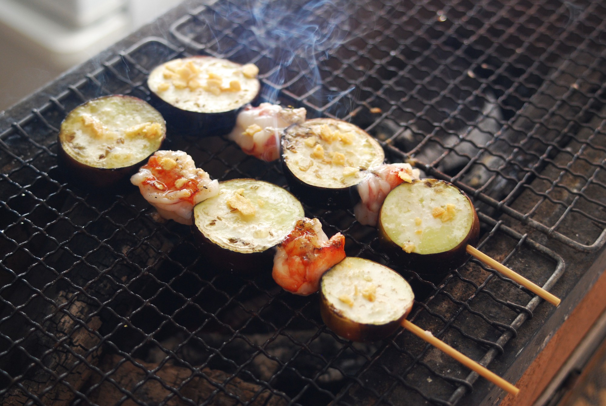 赤海老の殻をむき、背ワタを取り除いたら、輪切りにしたナスと一緒に串に刺し、ナンプラーで味つけして焼く料理です。焼き上がりにレモンを一絞りすると、まるでタイの屋台料理のようなおいしさ。パクチーを添えて食べてもおいしいですよ。