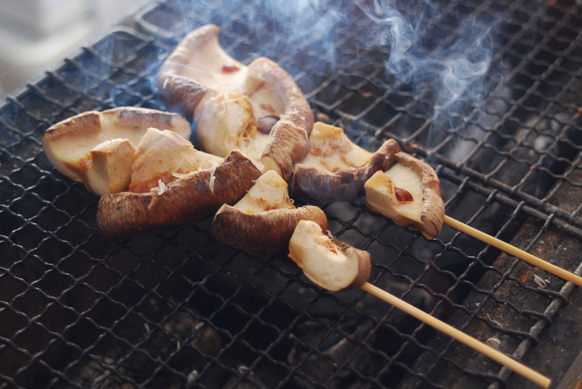 身の厚いしいたけを1/4にカットし、炭火でじっくり焼きます。しいたけの水分が上がってきたら、醤油を一回しかけ、たっぷりのパルミジャーノ・レッジャーノを振って完成。