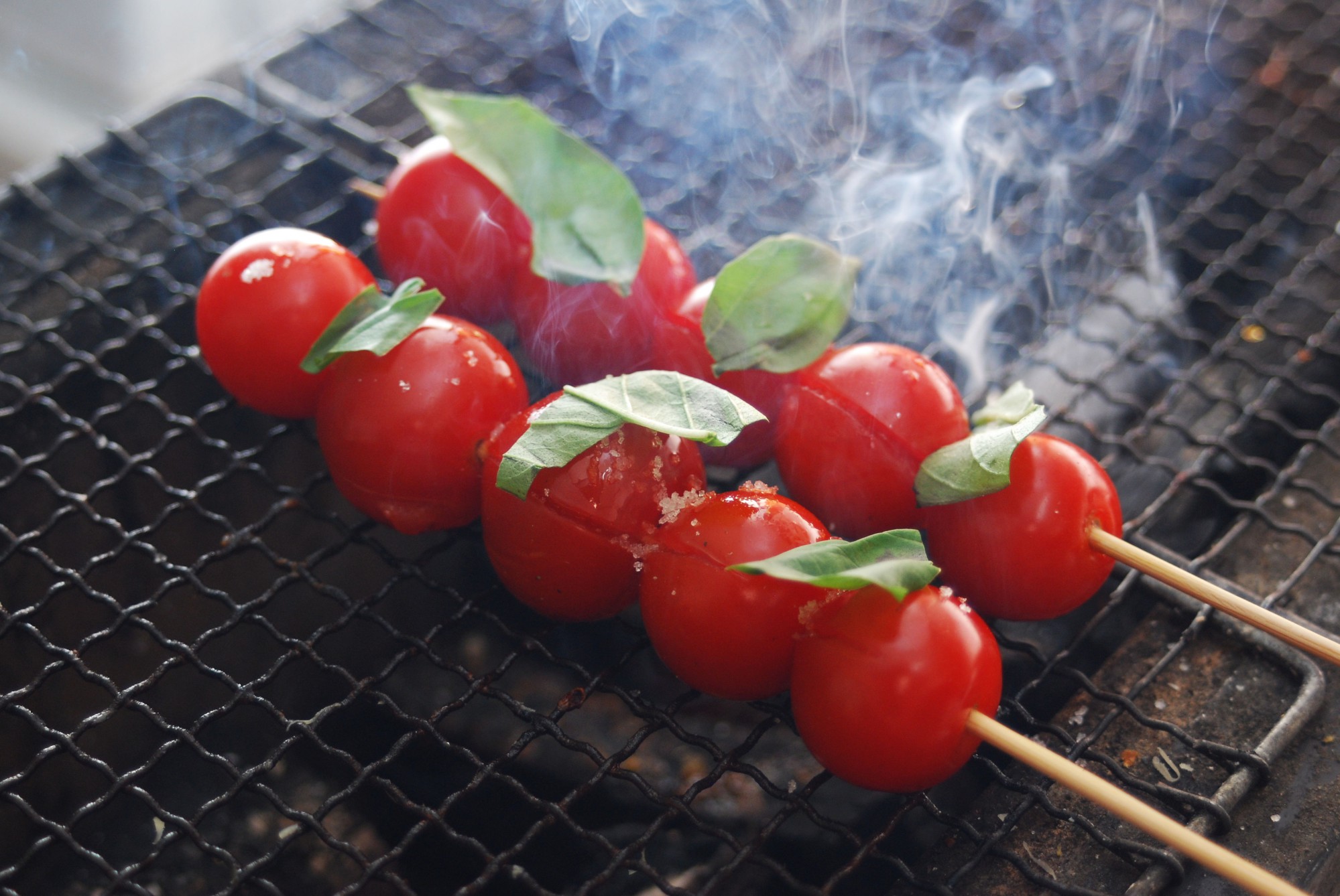 フレッシュなミニトマトを串に刺したらオリーブオイルを回しかけ、塩を振ってから炭火でじっくり焼きます。トマトに火が通り、身がぱっくりと割れてきたら、ちぎったバジルを乗せて完成。とてもシンプルな串野菜ですが、それだけに材料一つひとつの品質がものをいいます。