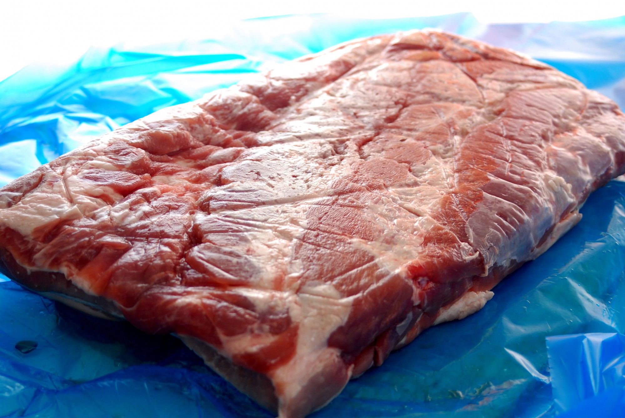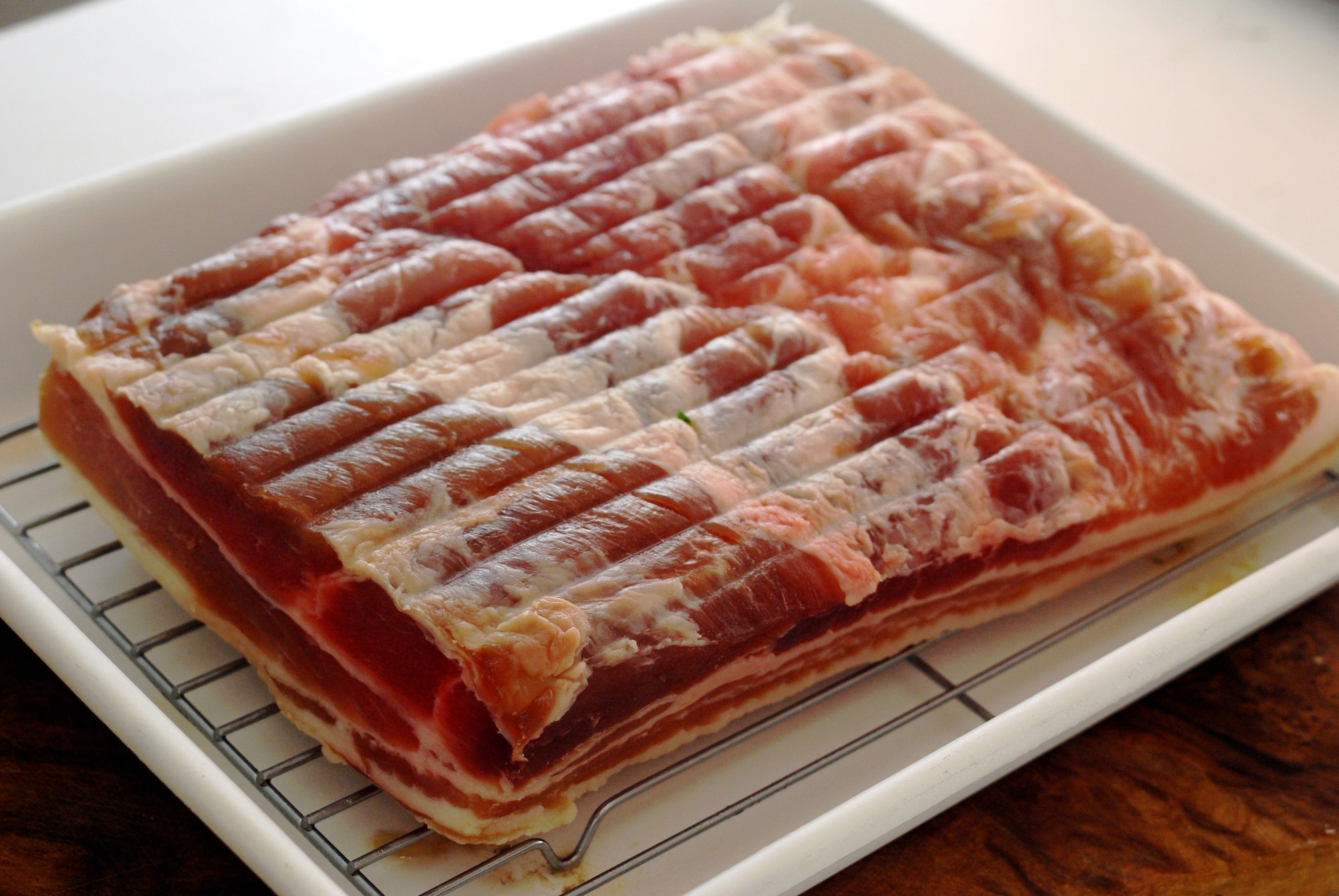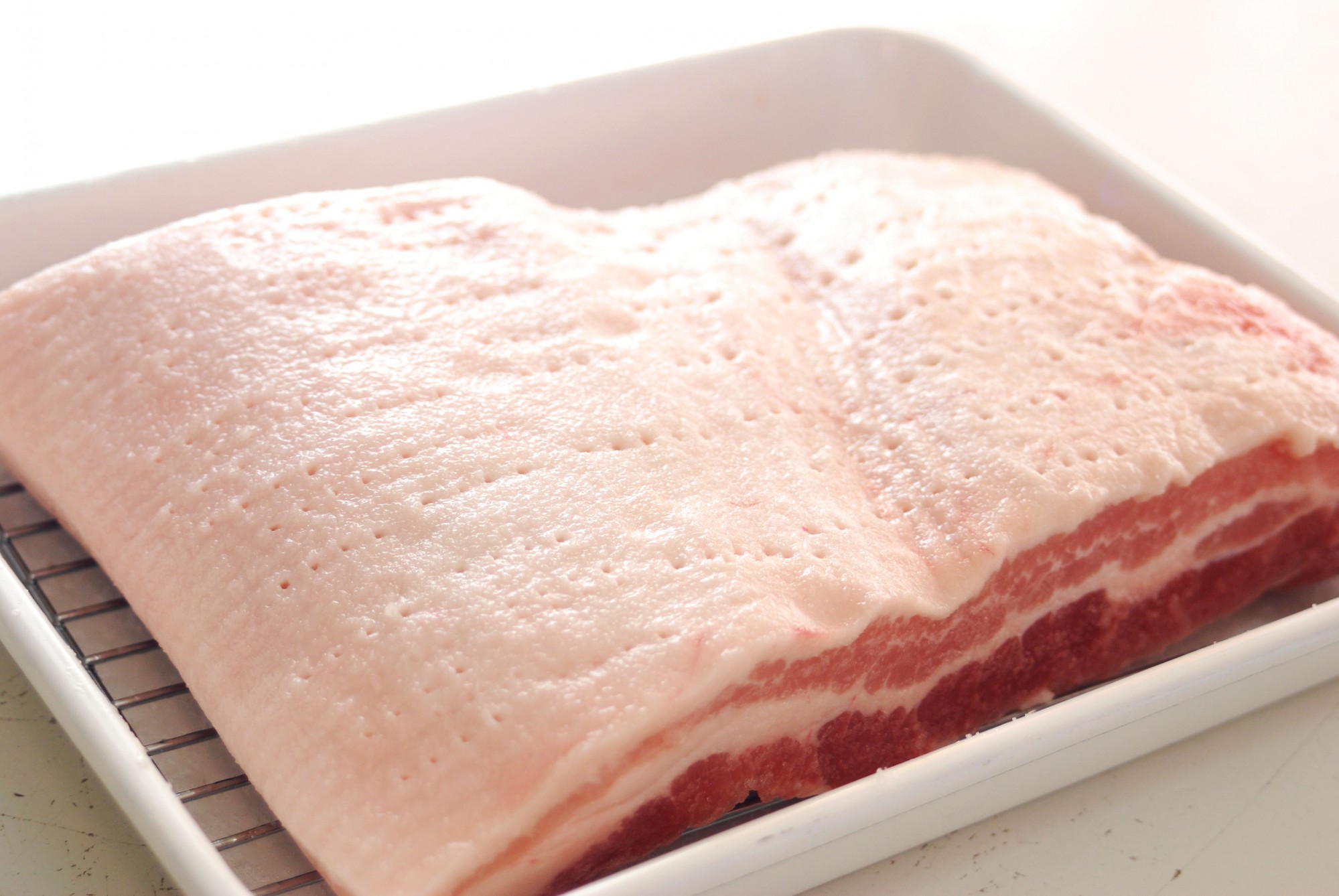 ちなみに、ベーコン用の肉には、脂身と赤身がはっきりと分かれて層になっているバラ肉が最適です。お肉を選ぶ際は、できるだけ層がはっきりと分かれ、赤身が三段ほど見えるものを選びましょう。