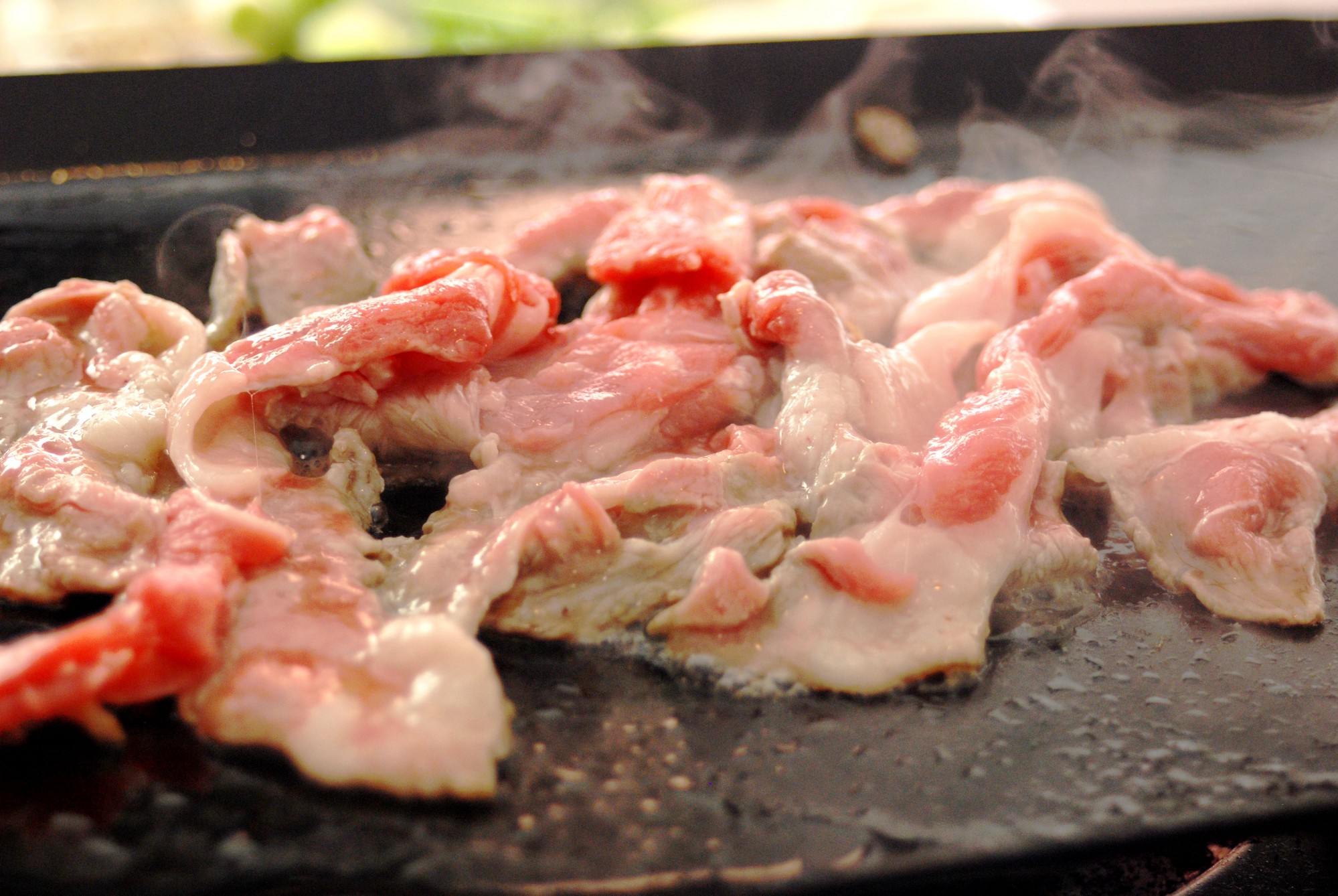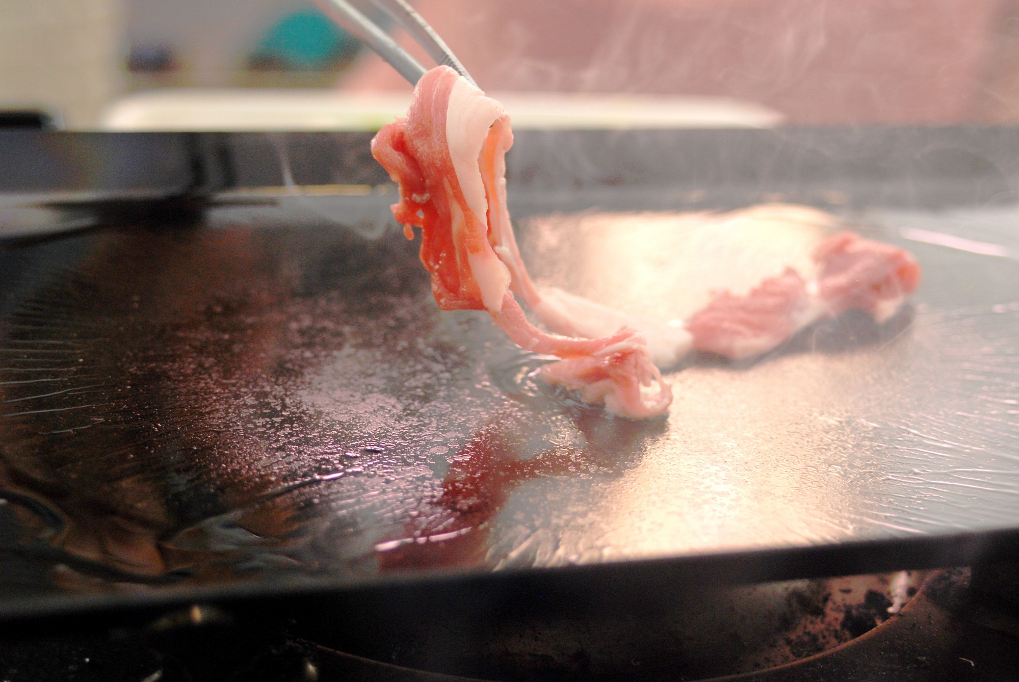 油を引いて熱した鉄板に、ラム肉を広げて乗せていきます。使用する油はサラダ油で構いませんが、もし手に入るようでしたら羊肉の脂をご使用ください。