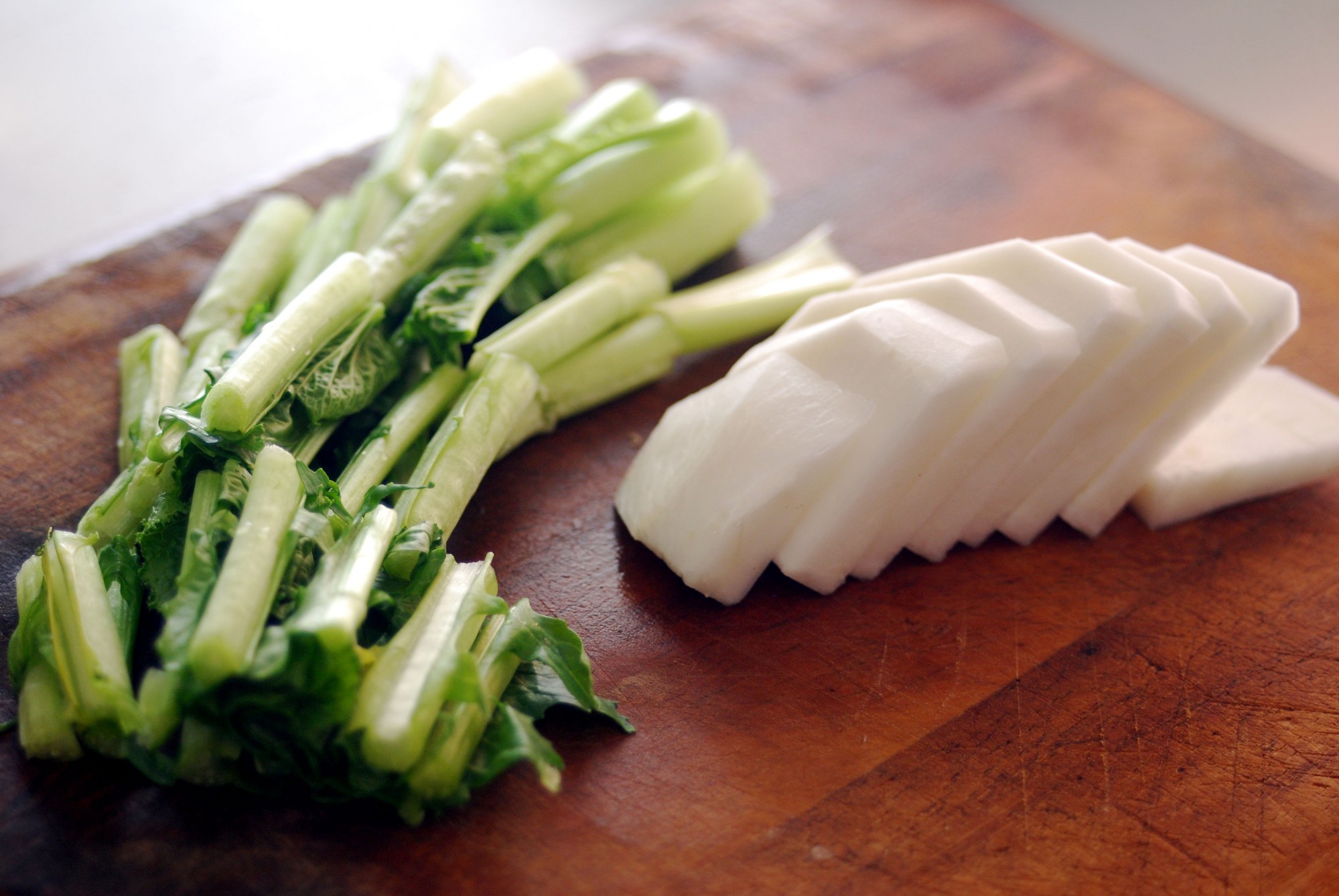 かぶの葉は3cm幅に。根茎は薄切りにしましょう。厚切りにしてじっくり焼き、ステーキで楽しむこともできます。お好みで調整してください。