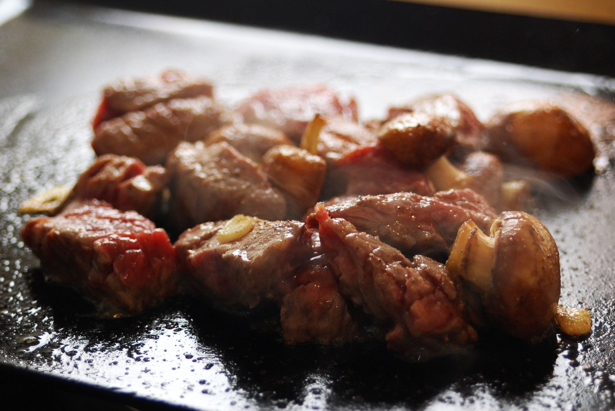 鉄板を熱したらサラダ油を薄く引き、スライスにんにくを炒めます。にんにくの香りが出てきたら、サイコロ状にカットした牛肉と1/4にカットしたマッシュルームを炒めます。肉の表面全体に焼き色がつく程度に火を入れたらバターと塩、ブラックペッパーを加えて全体をザクッと混ぜたら完成です。