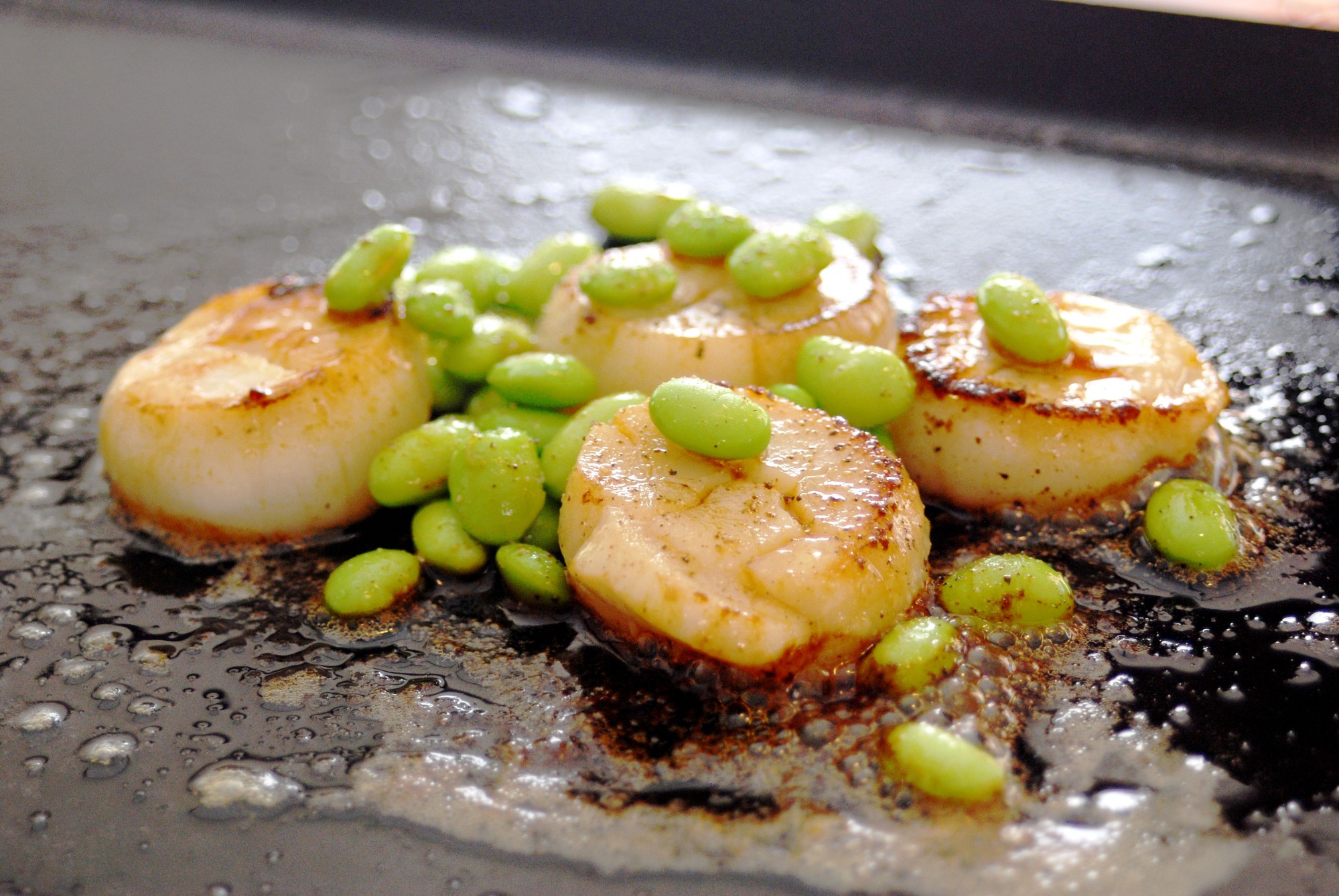 温めた鉄板にオリーブオイルを引いたら、たっぷりのバターを溶かしてホタテをレアに炒めます。ホタテの片面に焼き色がついたら醤油を一回しし、すべてのホタテをひっくり返します。すぐに枝豆を投入し、全体をザクっと混ぜてブラックペッパーを振ったら完成です。