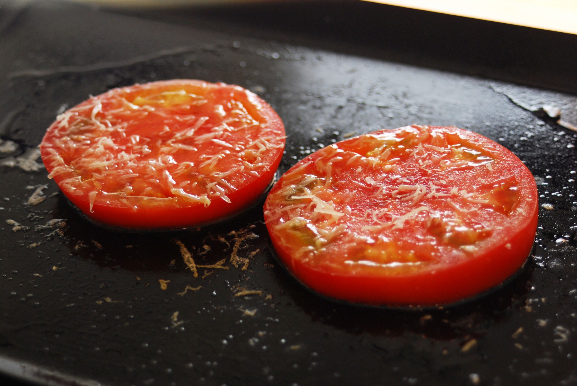 作り方は簡単で、オリーブオイルを薄く引いた鉄板の上でスライストマトを焼き、仕上げにオリーブオイル、パルミジャーノ・レッジャーノ、塩を振りかけるだけ。