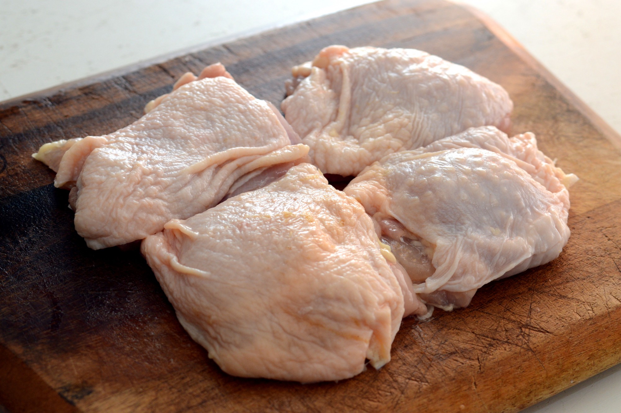 鶏もも肉を適当なサイズにカットします。鶏肉は焼くと水分が抜けて一回りほど小さくなるので、気持ち大きめにカットするのがおすすめです。