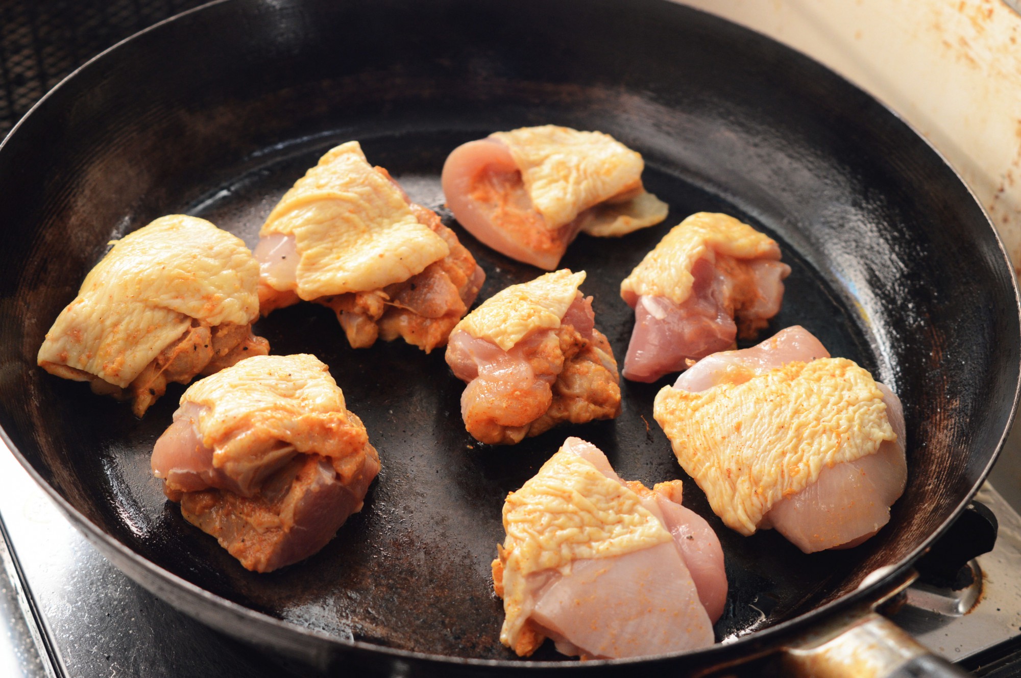 調味だれに十分に漬け込んだ鶏肉を、サラダ油を引いたフライパンで焼きます。