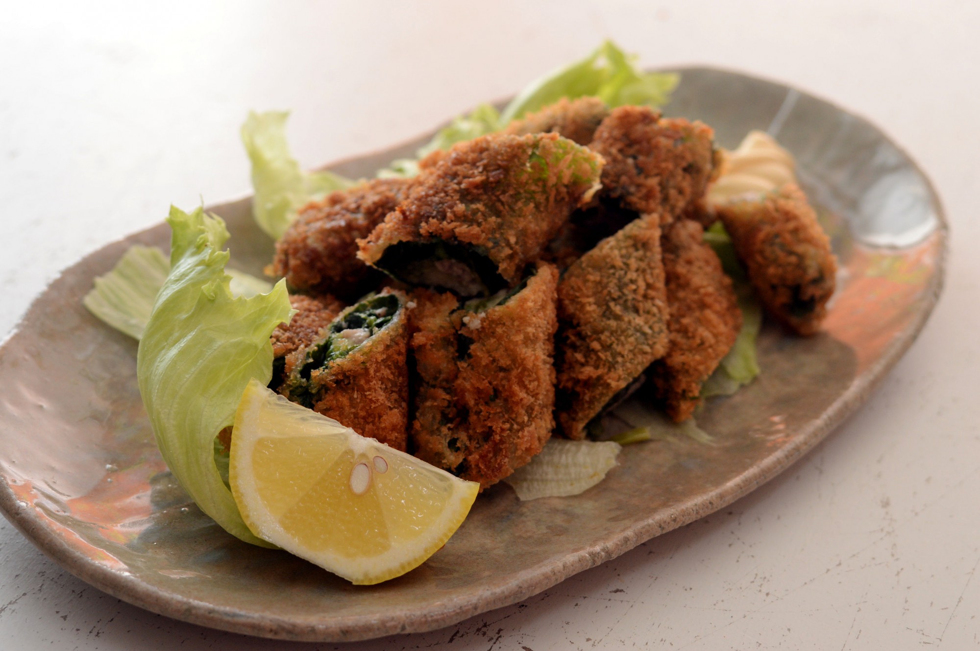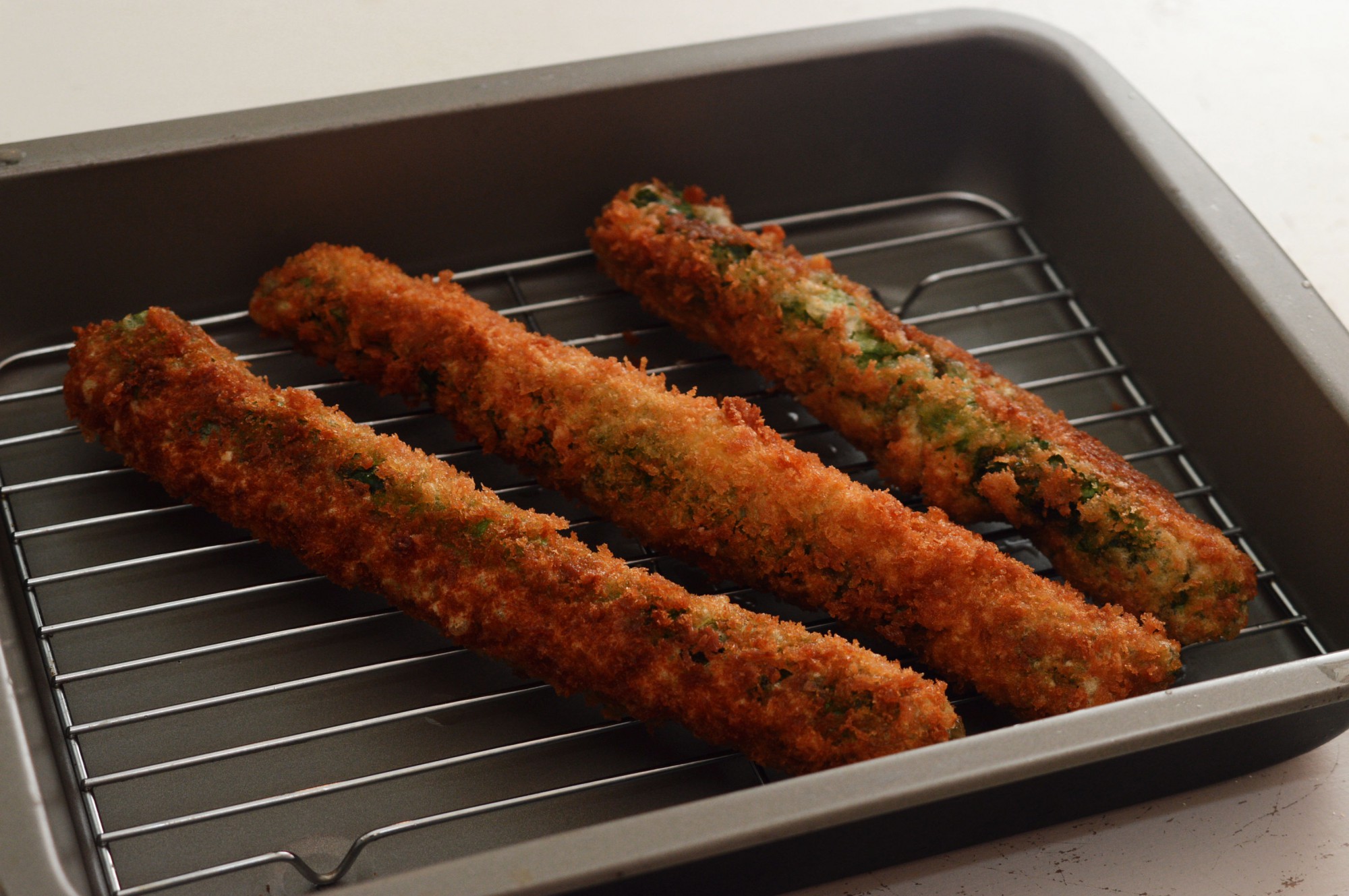 豚こまスティックは、こま切れ肉とチーズをほうれん草で包んで棒状にし、衣をつけて揚げた料理です。