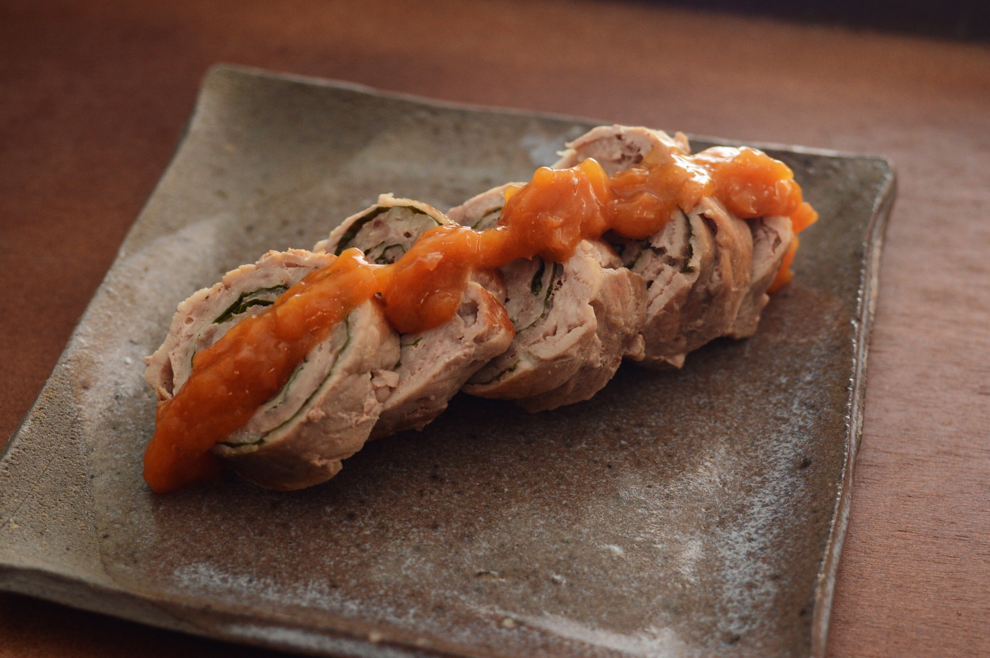 豚こまの梅だれ大葉巻き