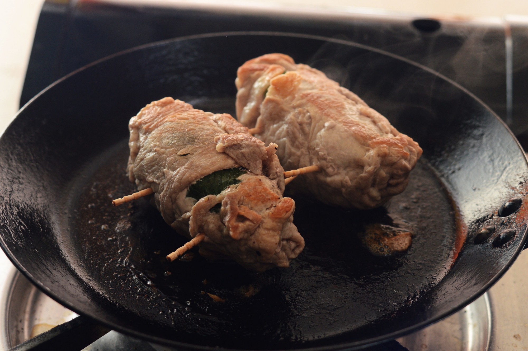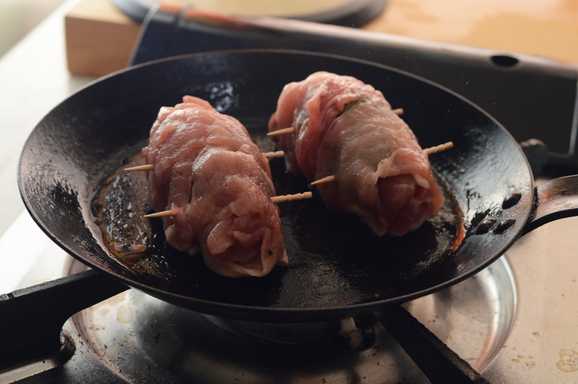 大葉を巻き込みながら、端から肉をくるくると巻いていき、最後に写真のように爪楊枝で止めます。こうすることで、火を通しても形が崩れにくくなります。