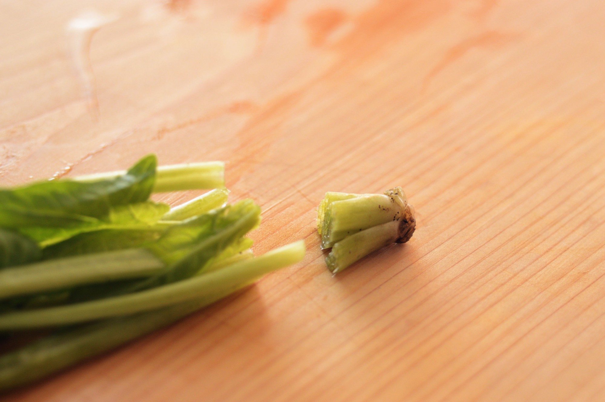 ほうれん草は根っこの部分に土が溜まりやすいので、写真のように切り落とし、根付近についている汚れを流水でしっかりと洗い落としましょう。