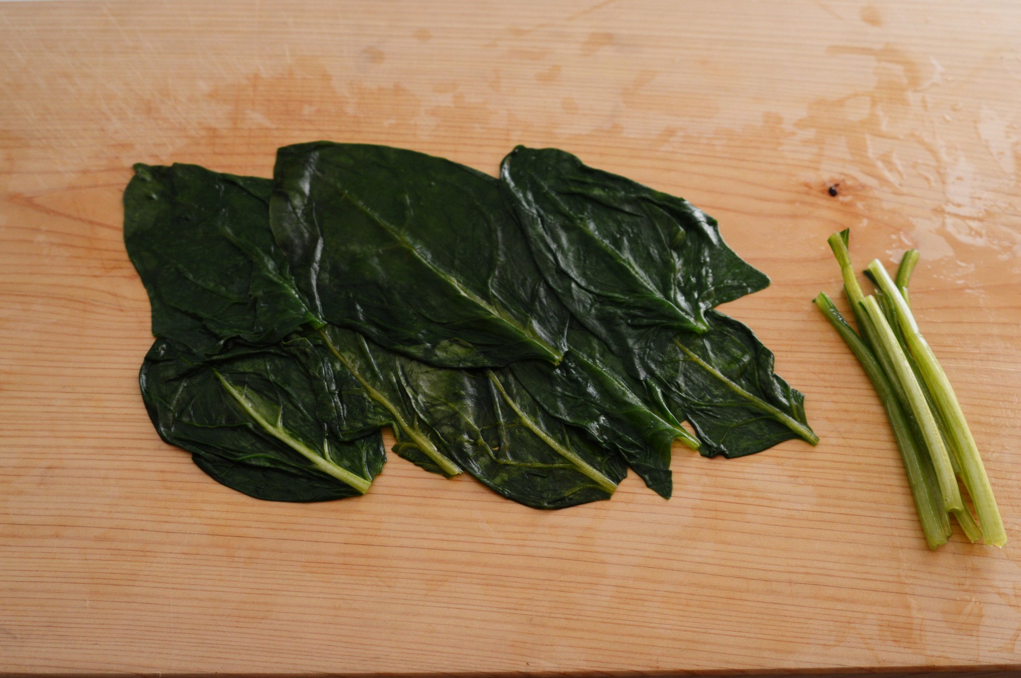 鍋にたっぷりの水を沸かし、ほうれん草をさっと茹でます。茹で時間は10秒ほどです。ほうれん草を茹でたら鍋から引き揚げ、キッチンペーパーなどで水気を拭いたら、写真のように葉と茎を切り分けます。