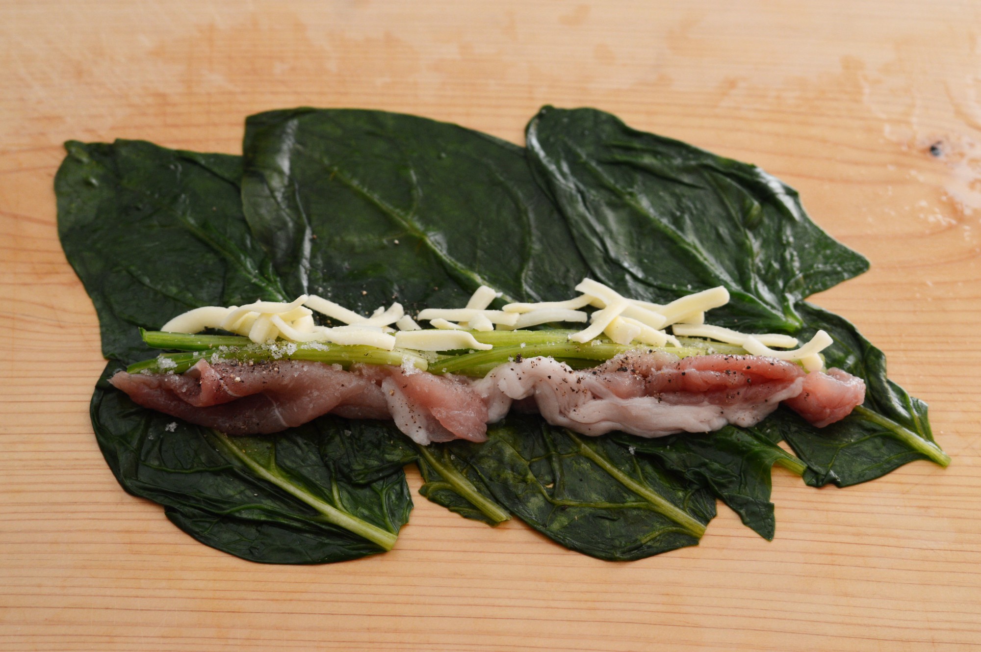 ほうれん草の葉が少し重なり合うように広げて並べたら、中央よりやや下にこま切れを細く並べ、ほうれん草の茎とチーズも一緒に並べます。スティック1本につき1gの塩と1gの黒こしょうを振りましょう。