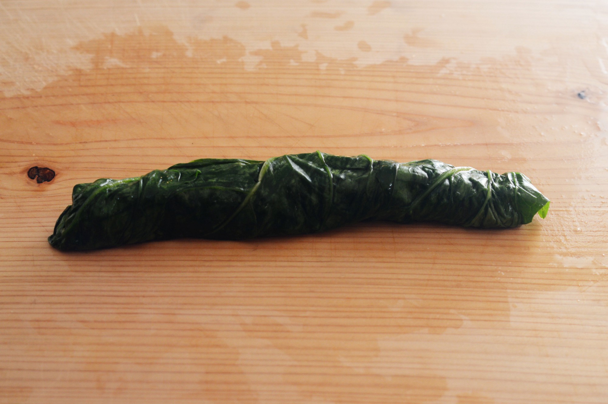 ほうれん草を下からくるくる巻くようにして、棒状に具を巻きます。ほうれん草の葉が破れやすいので、優しくていねいに作業しましょう。