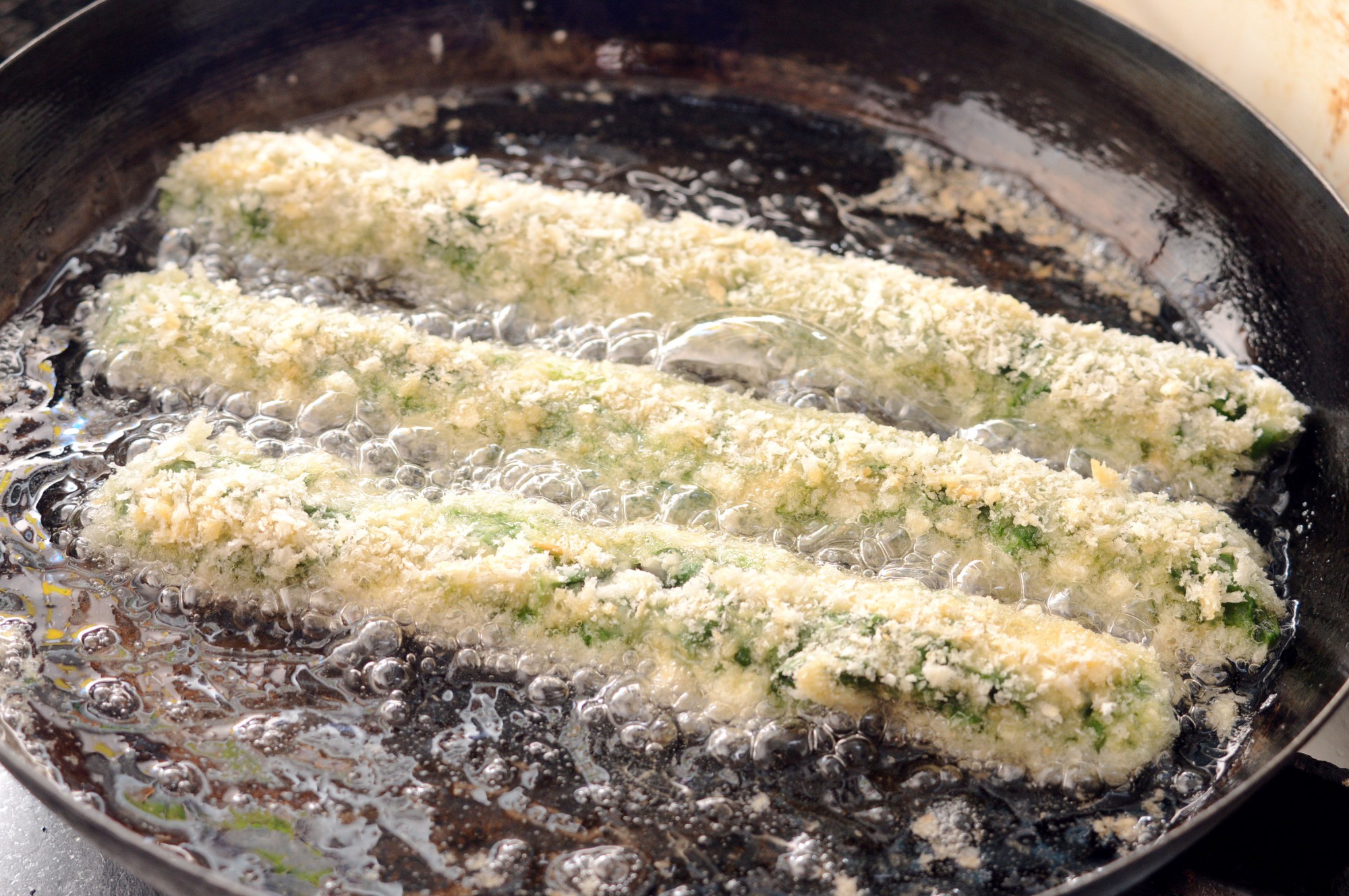 鍋底から7mmほどの高さまで揚げ油(サラダ油や米油、ごま油など)を注いで、スティックを揚げ焼きにします。170℃程度の温度で揚げ焼きにするのが理想的です。