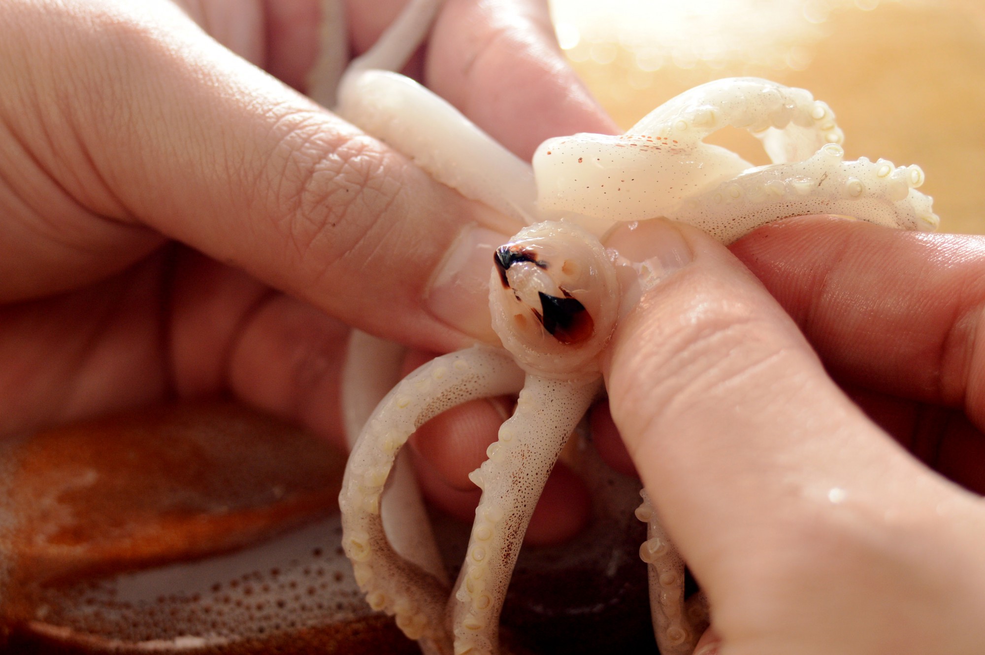 スルメイカのくちばしは足の間にあります。普段は外側からくちばしは見えませんが、手で口をひっくり返すようにすると、中からくちばしが出てきます。このくちばしは硬くて食べられないので取り除いておきましょう。