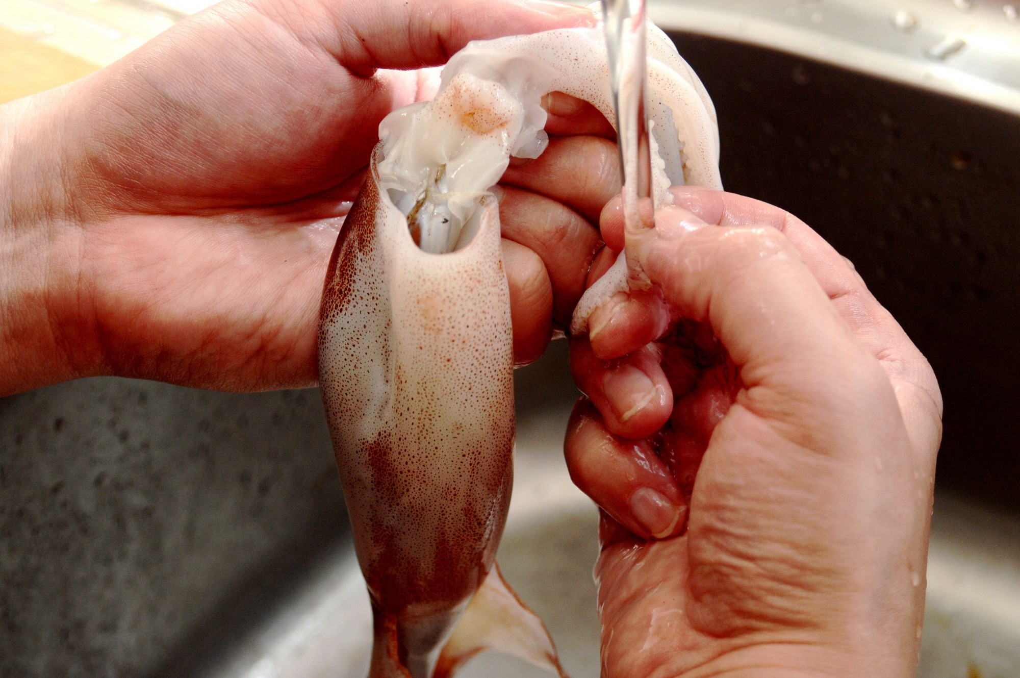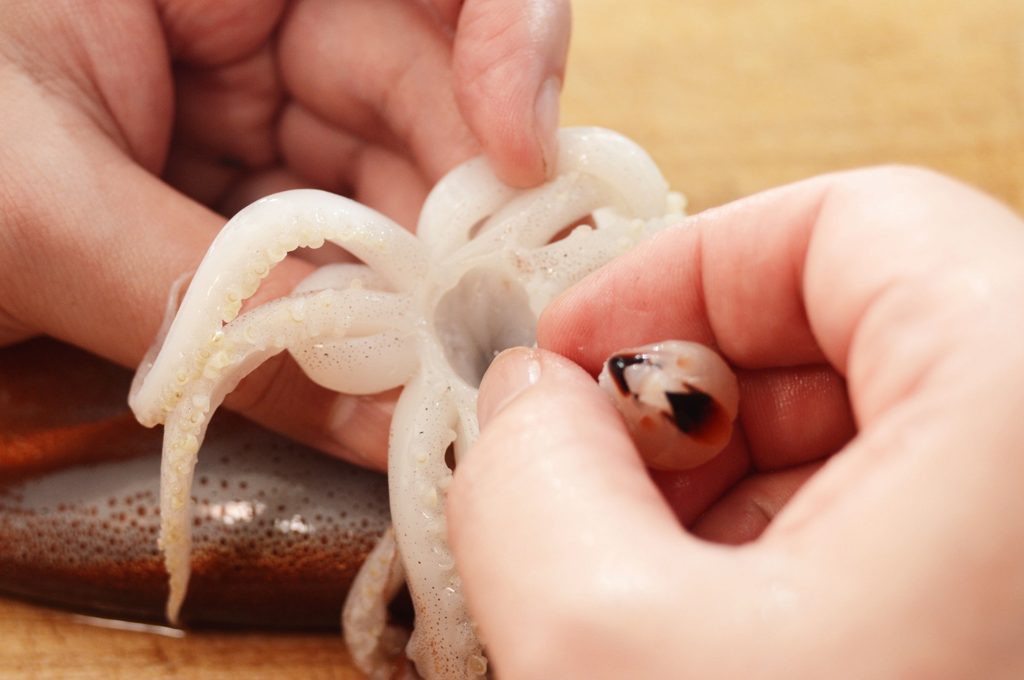 流水にあてながら手でイカの足をしごくと、次々に取り除くことができます。硬く絞った布巾などでイカの足をつかんでしごいても効果的です。