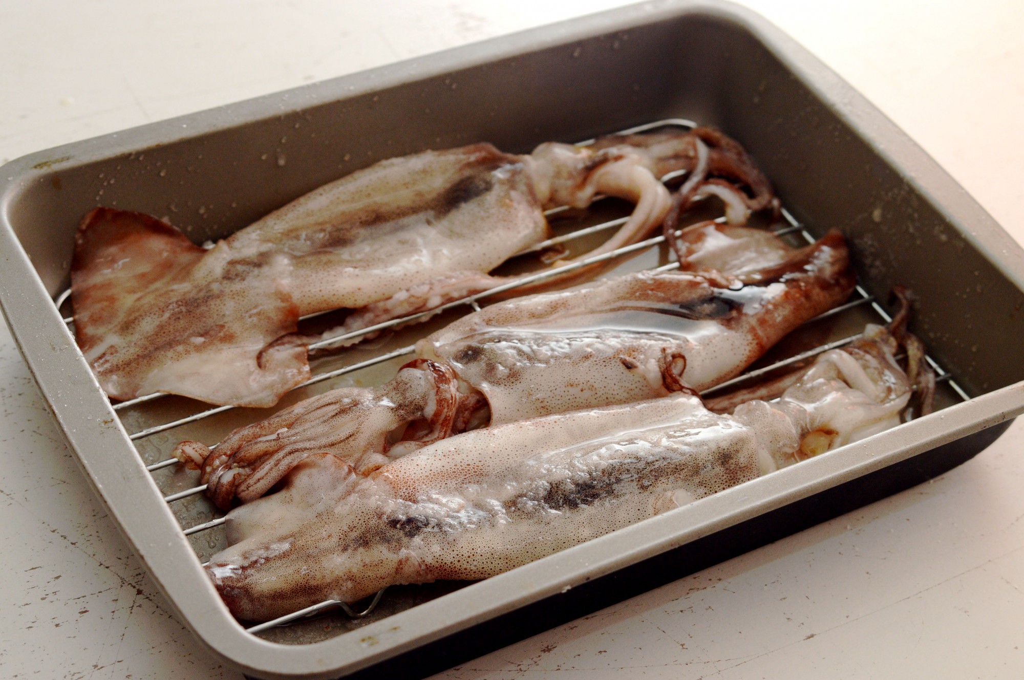 スルメイカに塩を振ると、塩の浸透圧でイカの水分が出てきます。出てきた水分は臭みや腐敗の原因となるので、できるだけイカに触れさせないようにしたいところ。網を敷いたバットなどを使うと便利ですよ。