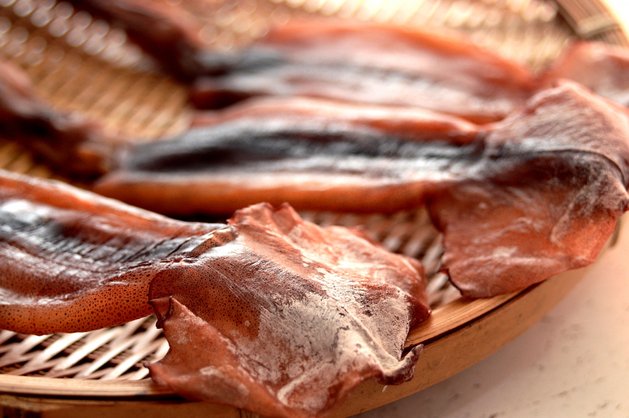 ちなみにスルメイカを干すと、写真のように白い粉のようなものが出てくることがあります。一見すると白カビのようでギョッとするかもしれませんがご安心ください。