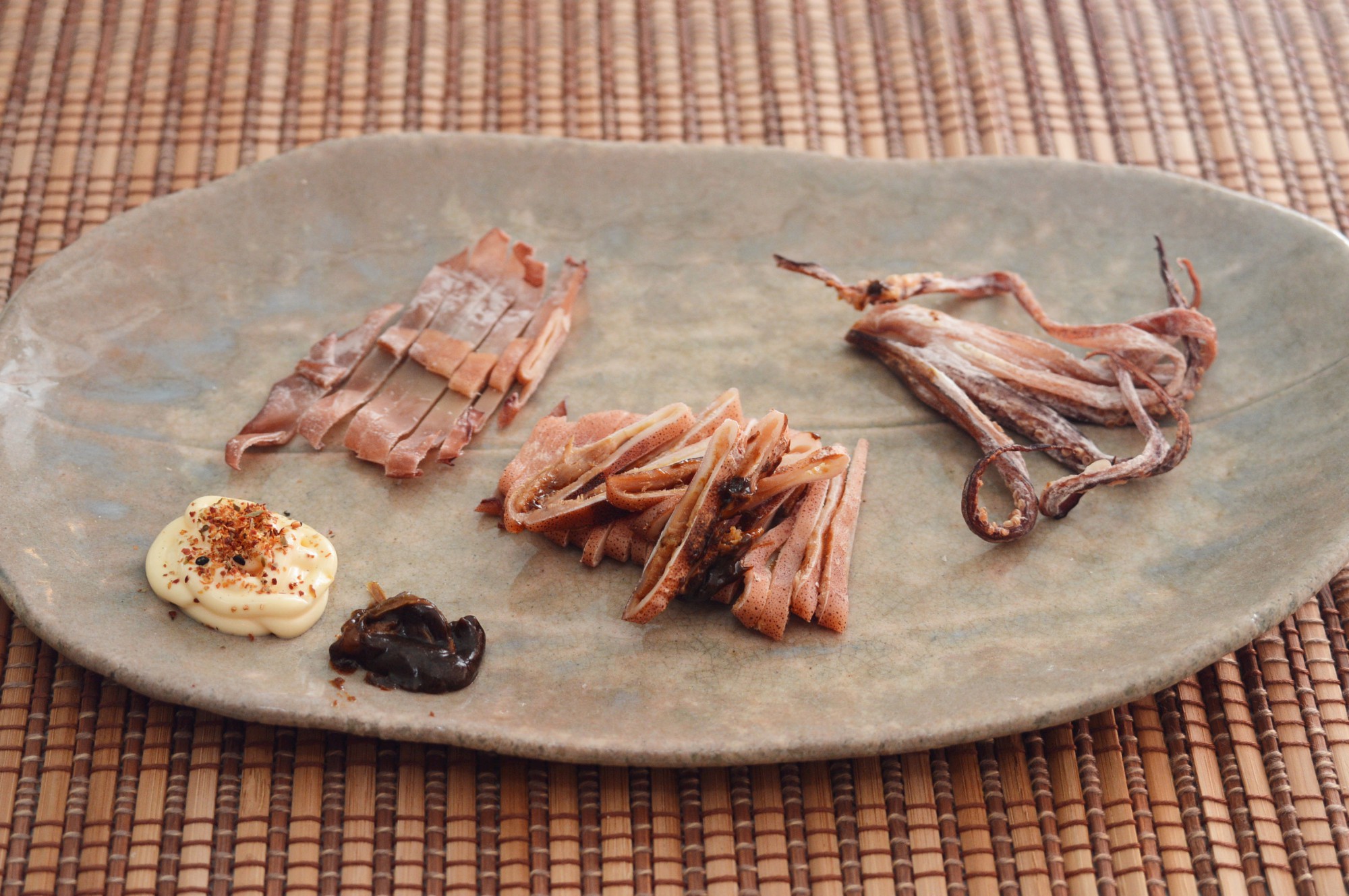 肝ごと丸干ししたスルメイカをストーブで炙り、七味唐辛子を混ぜたマヨネーズにつけて食べる……。