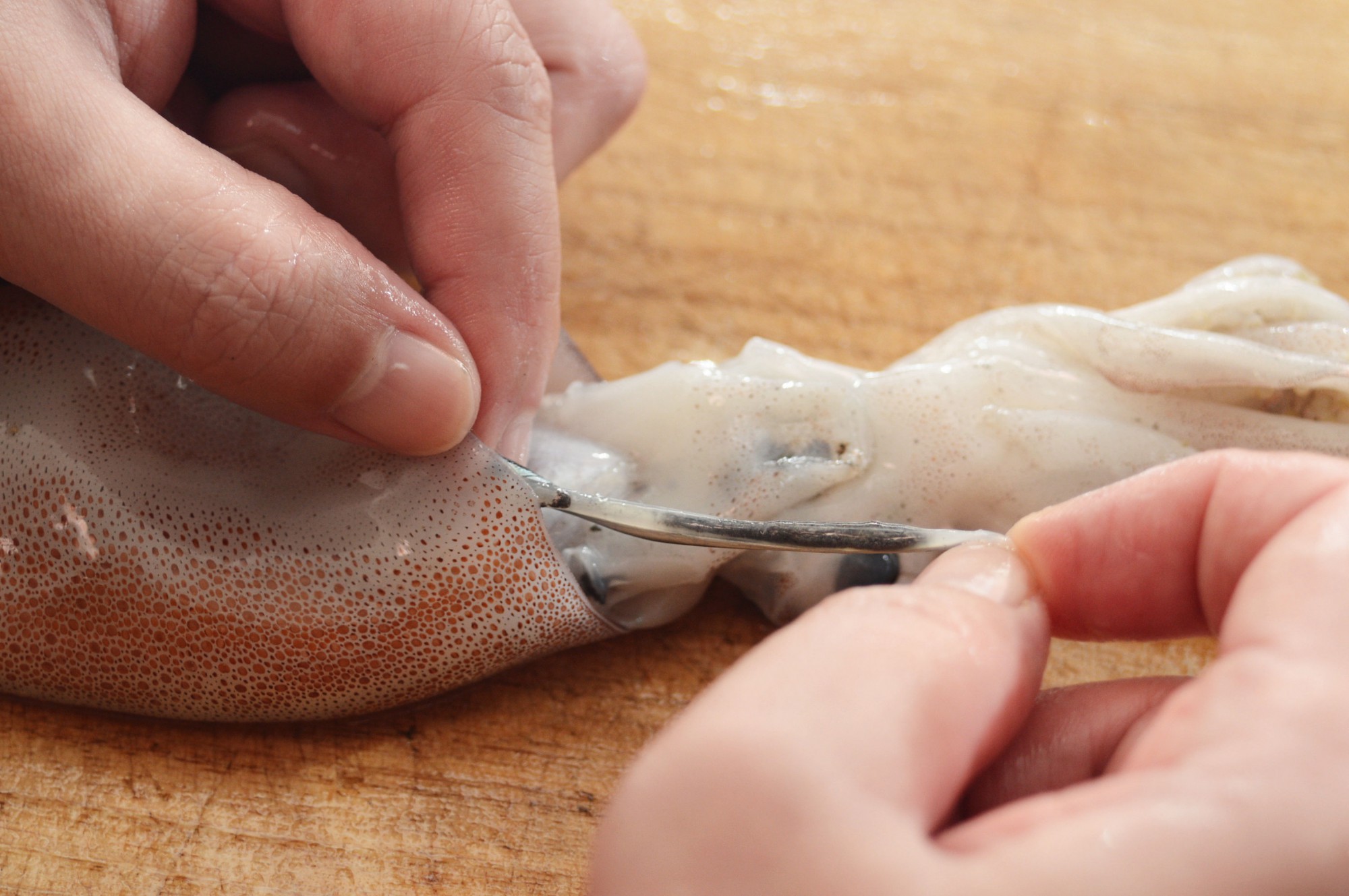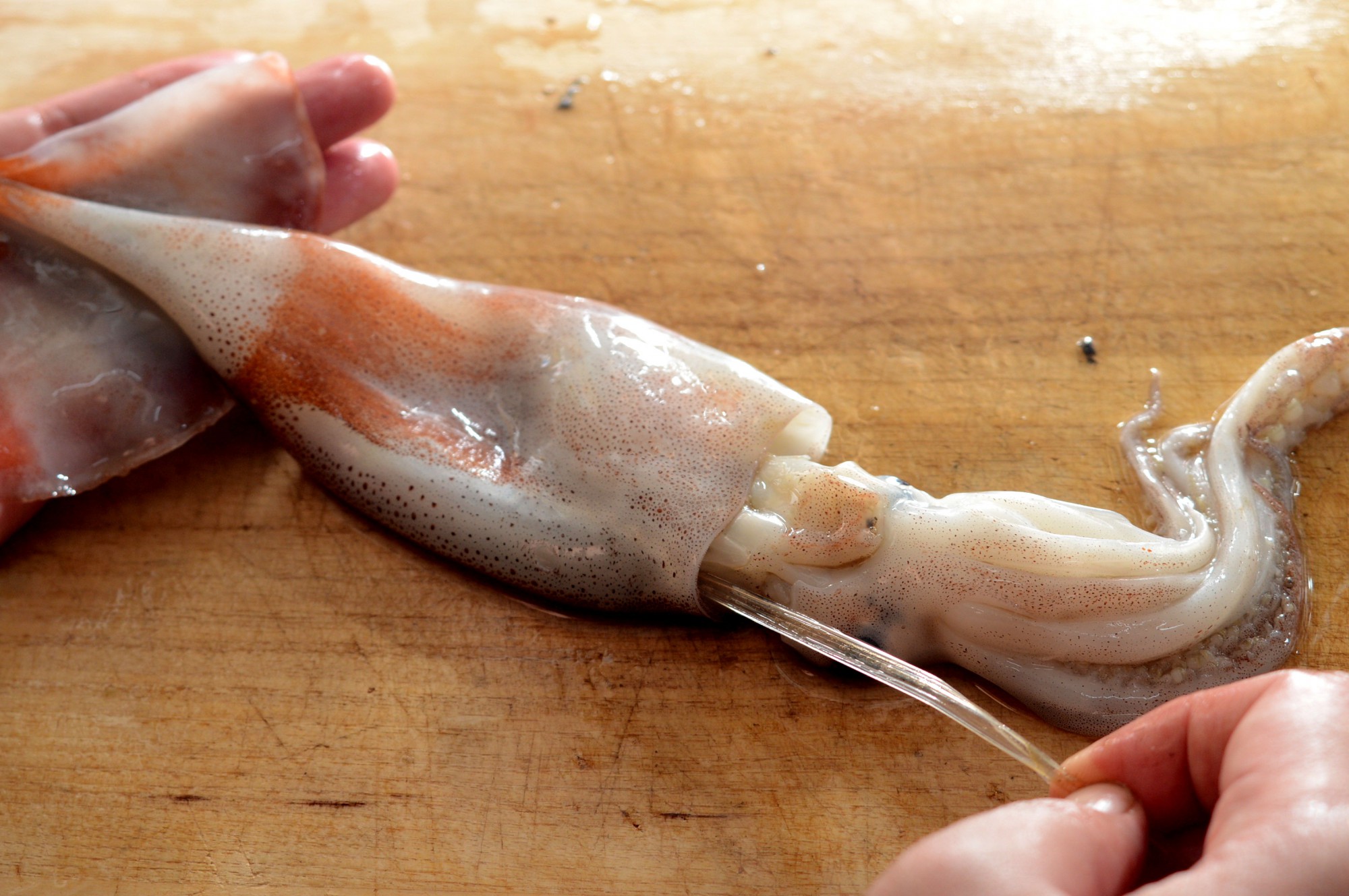 スルメイカの内臓を取り除いたら、次は骨を取り除きます。