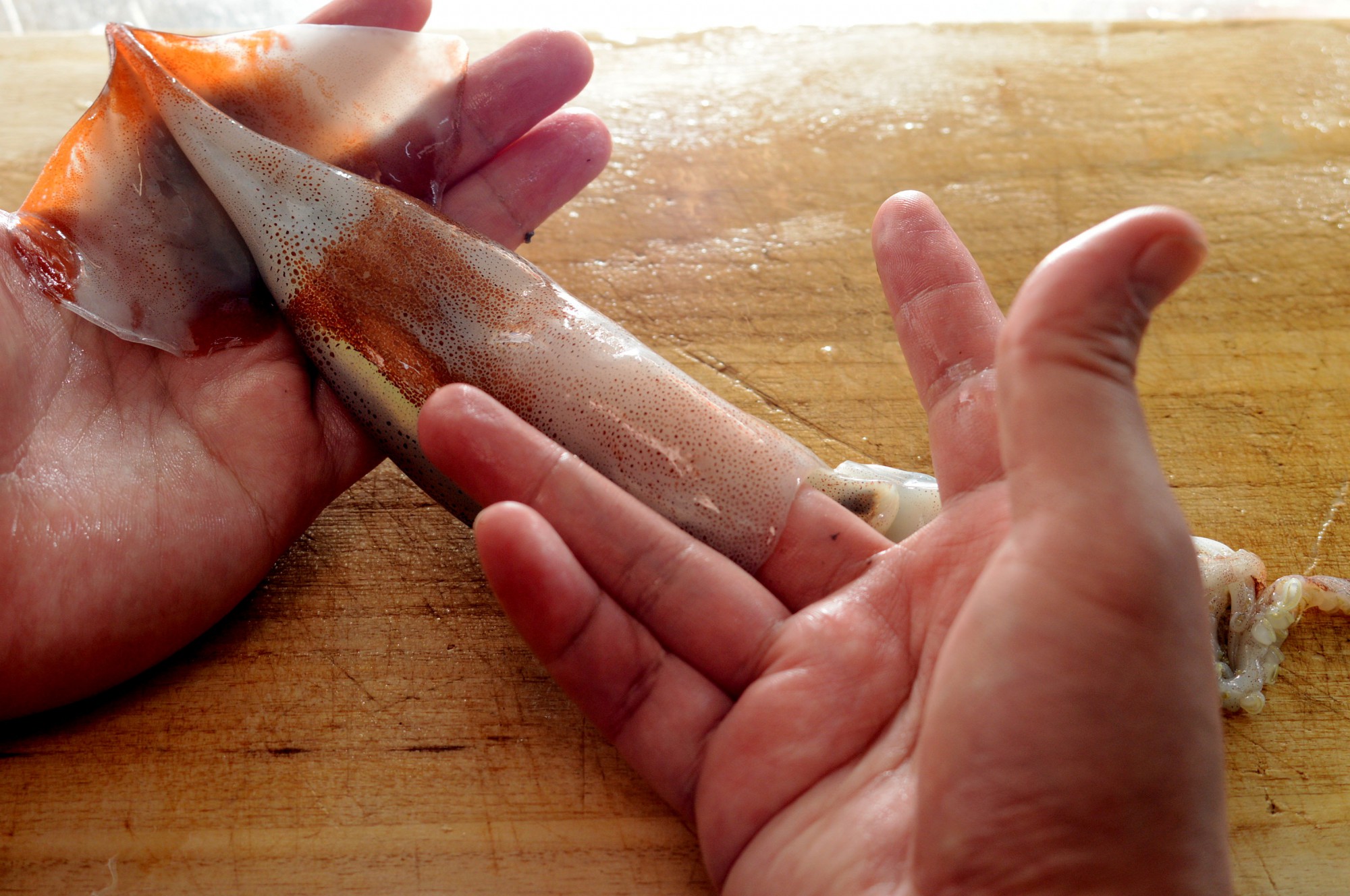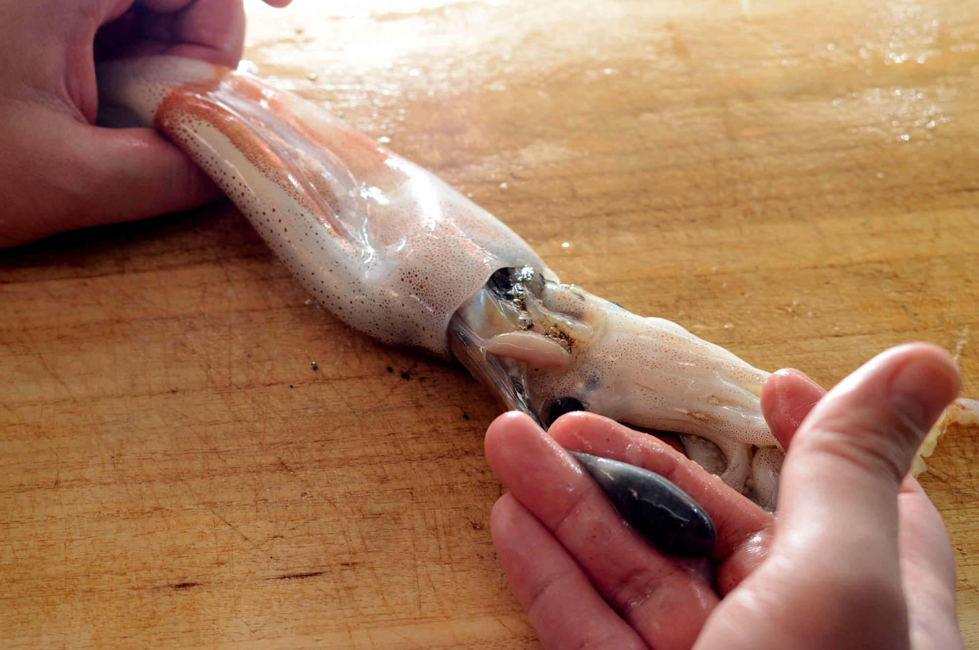 それでは丸干しを作っていきましょう!まずはスルメイカの食べられない部分を取り除くために手で処理していきますよ。