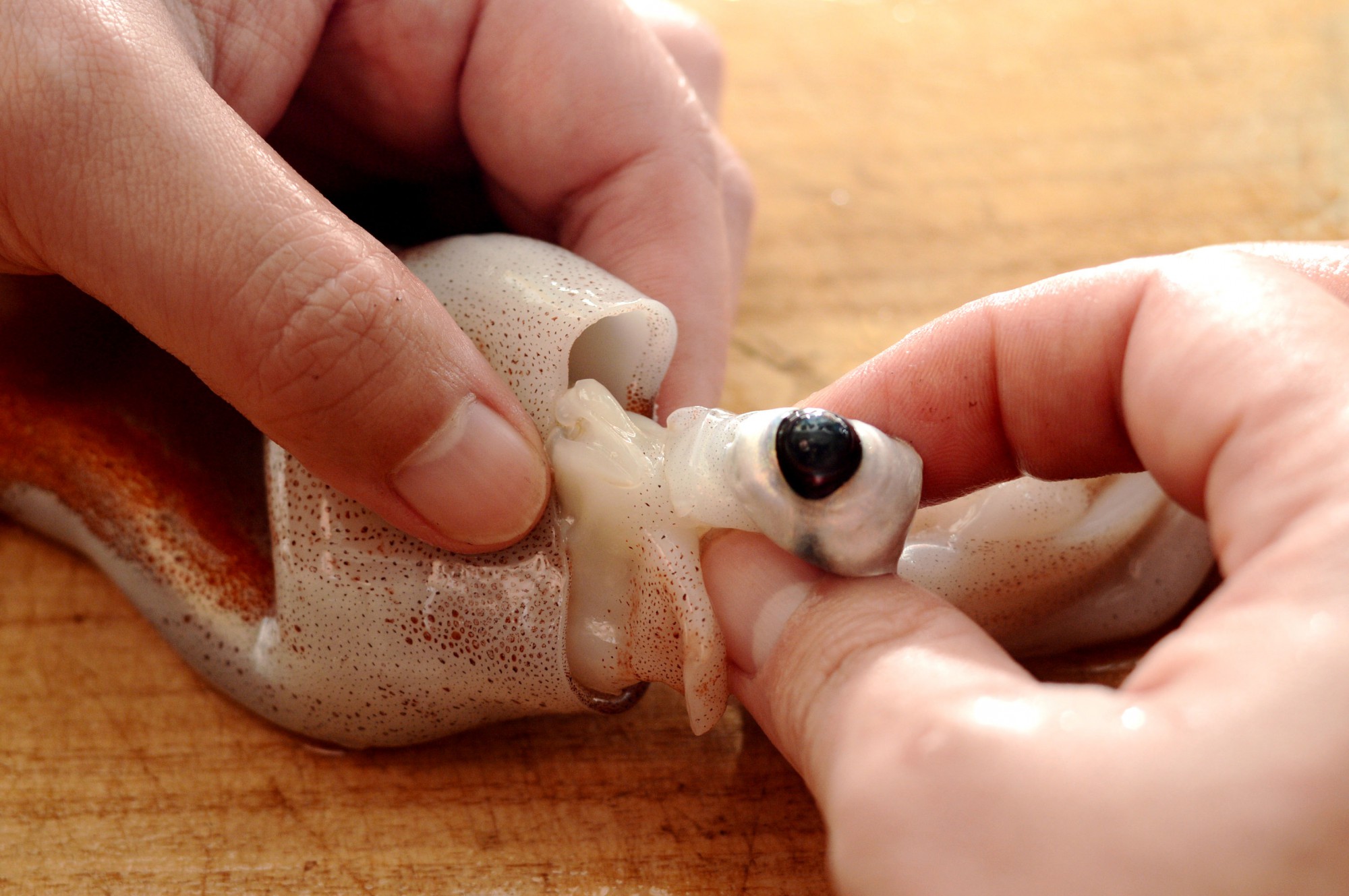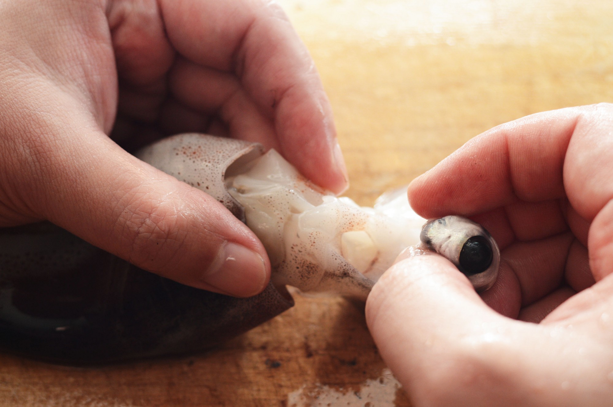 イカの目の玉をつぶすと、水がピュッと飛び出してあたりを汚してしまうかもしれません。目を破かないよう、根本からつまみ取りましょう。慣れてくるとつぶさずに取り除けるようになるはずです。
