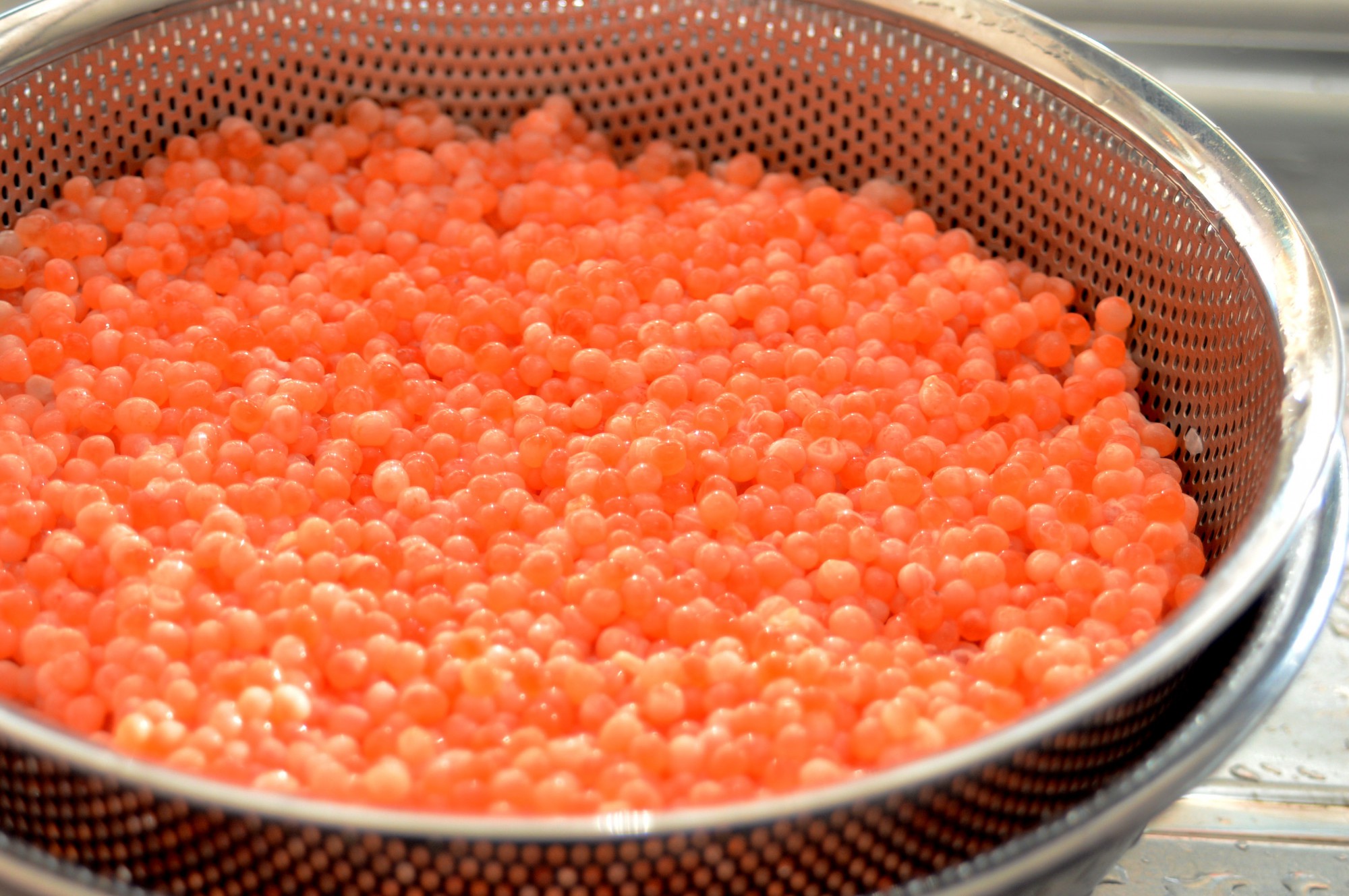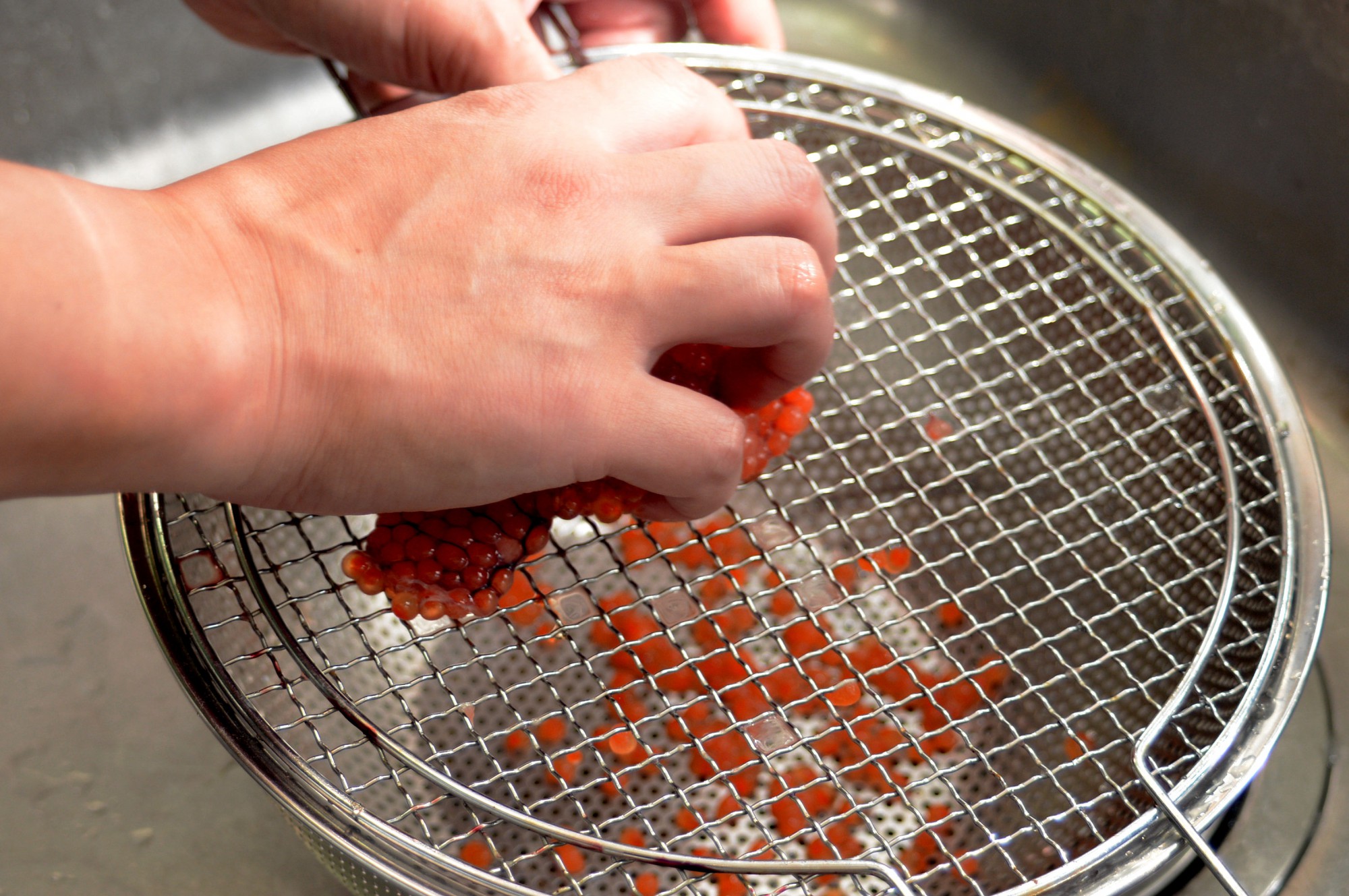 生筋子を開いたら、網目に優しく当てながらころころ転がします。すると卵がポロポロと外れていきます。すべての卵が外れるまで地道に続けてください。一つの生筋子を処理するのに2~3分程度。慣れないうちはもう少しかかるかもしれません。
