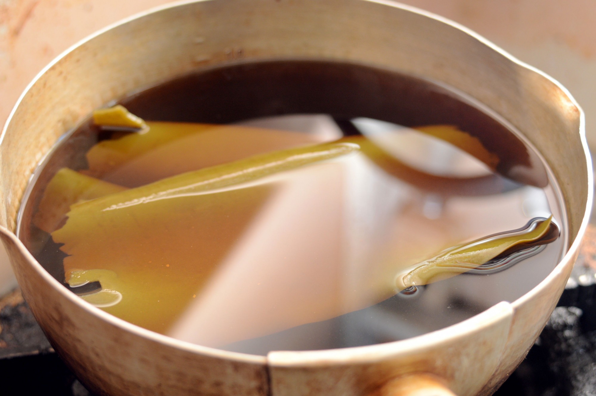 鍋に乾燥昆布と水を入れ、そのまま30分ほど置いておきます。できれば一晩置くと理想的です。こうすることで昆布の上品な出汁が取れます。