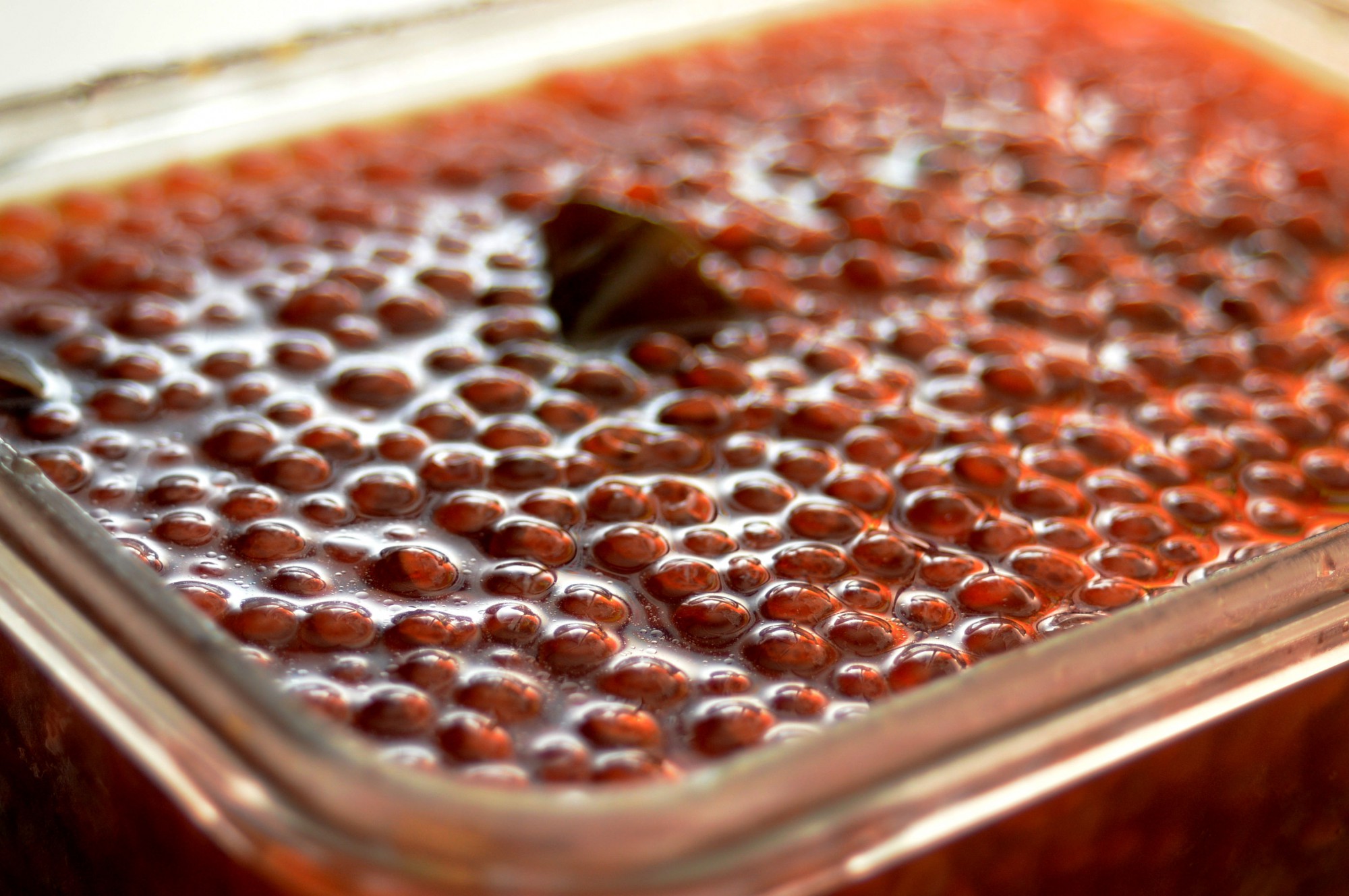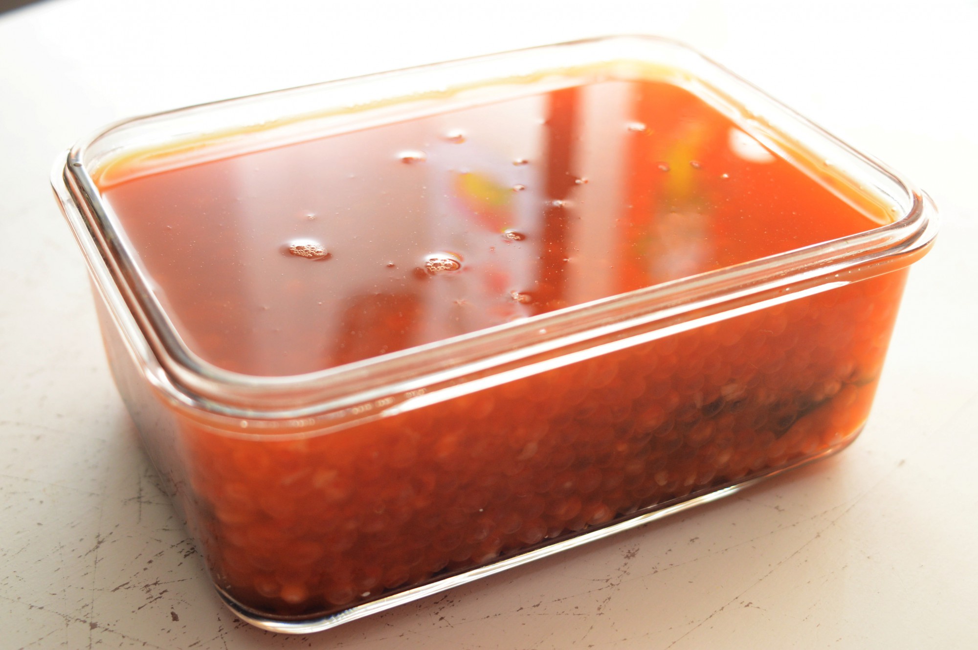 保存容器などに水気を切ったいくらを移し、冷ました調味液をひたひたになるまで注ぎます。このまま一晩置いたらいくらの醤油漬けの完成です。
