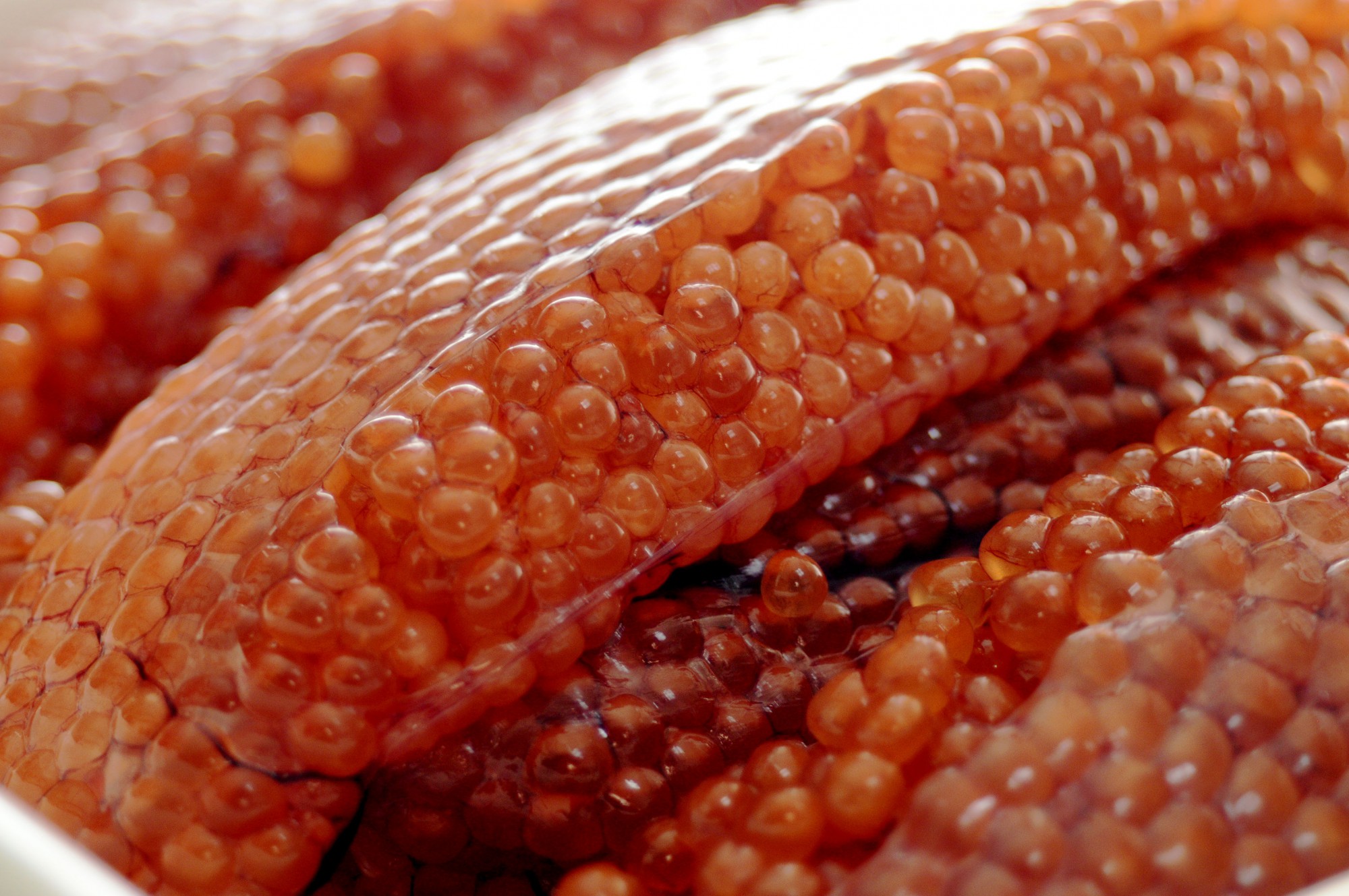 いくらの醤油漬けは、鮭の卵がつながったままの生筋子をほぐして掃除し、醤油だれに漬けて作ります。醤油だれの味が卵の中に染み込み、いくらの脂分と合わさってあのおいしい味が完成するのです。