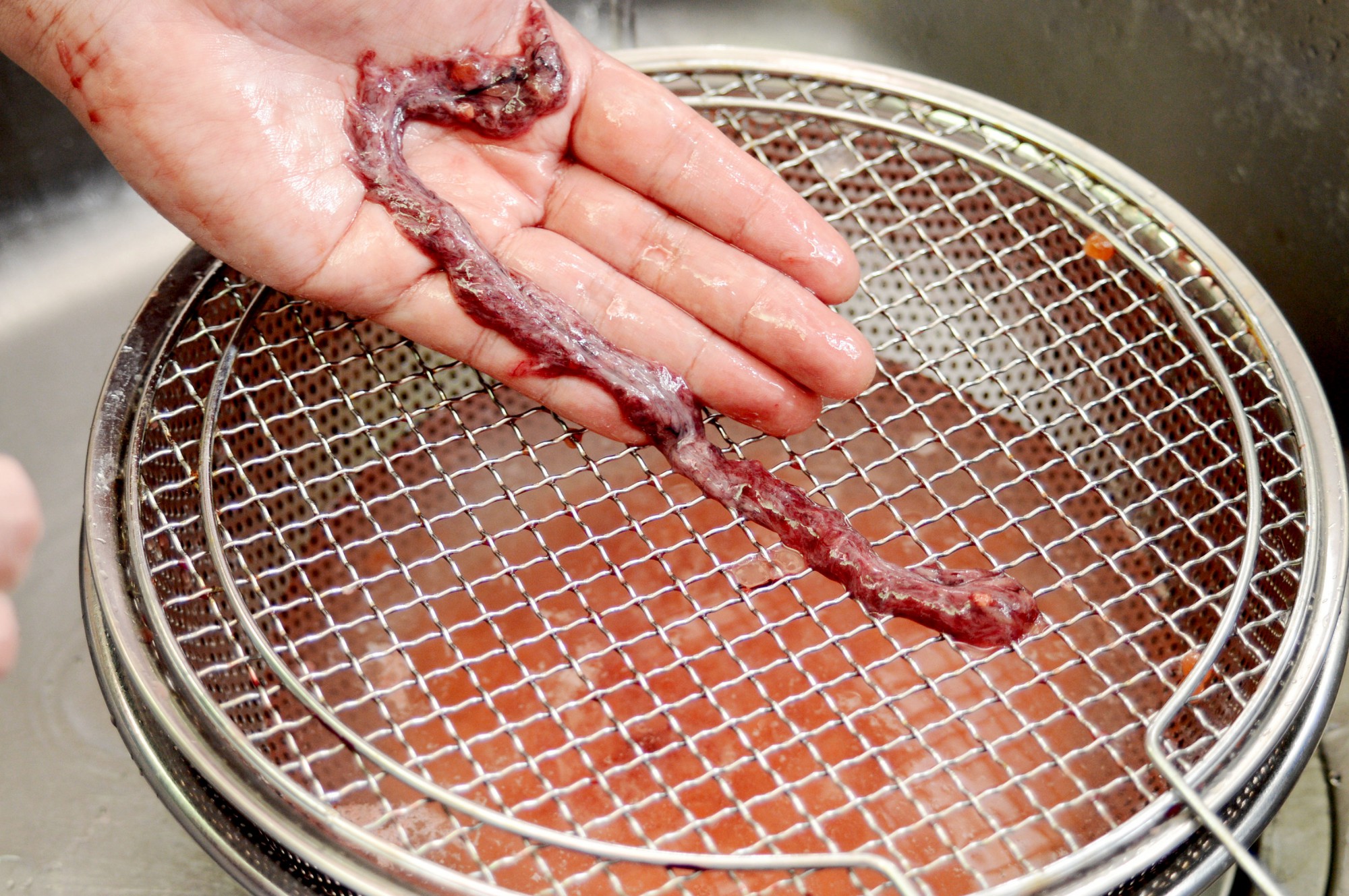 すべての卵がほぐれると、最後はこのように筋と皮だけが残ります。この部分は使わないので捨ててしまって構いません。