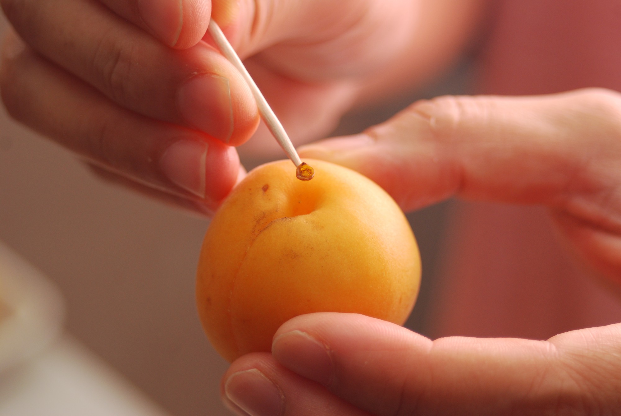 梅のヘタは、写真の通り爪楊枝など先端が細く尖っているものを用いると簡単に取り除けます。このとき、爪楊枝で梅の実を傷つけないよう十分に気をつけてください。