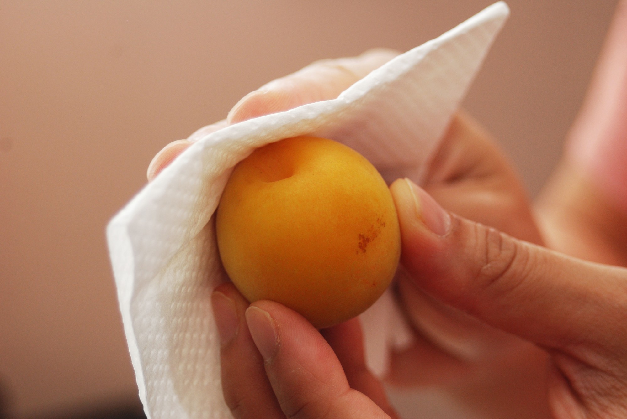 梅の実に水分が残っていると傷みやすくなるので、洗ったあとはキッチンペーパーなどでしっかり水気を拭き取りましょう。強くこすると実が傷つくので、一つひとつ優しく拭きます。