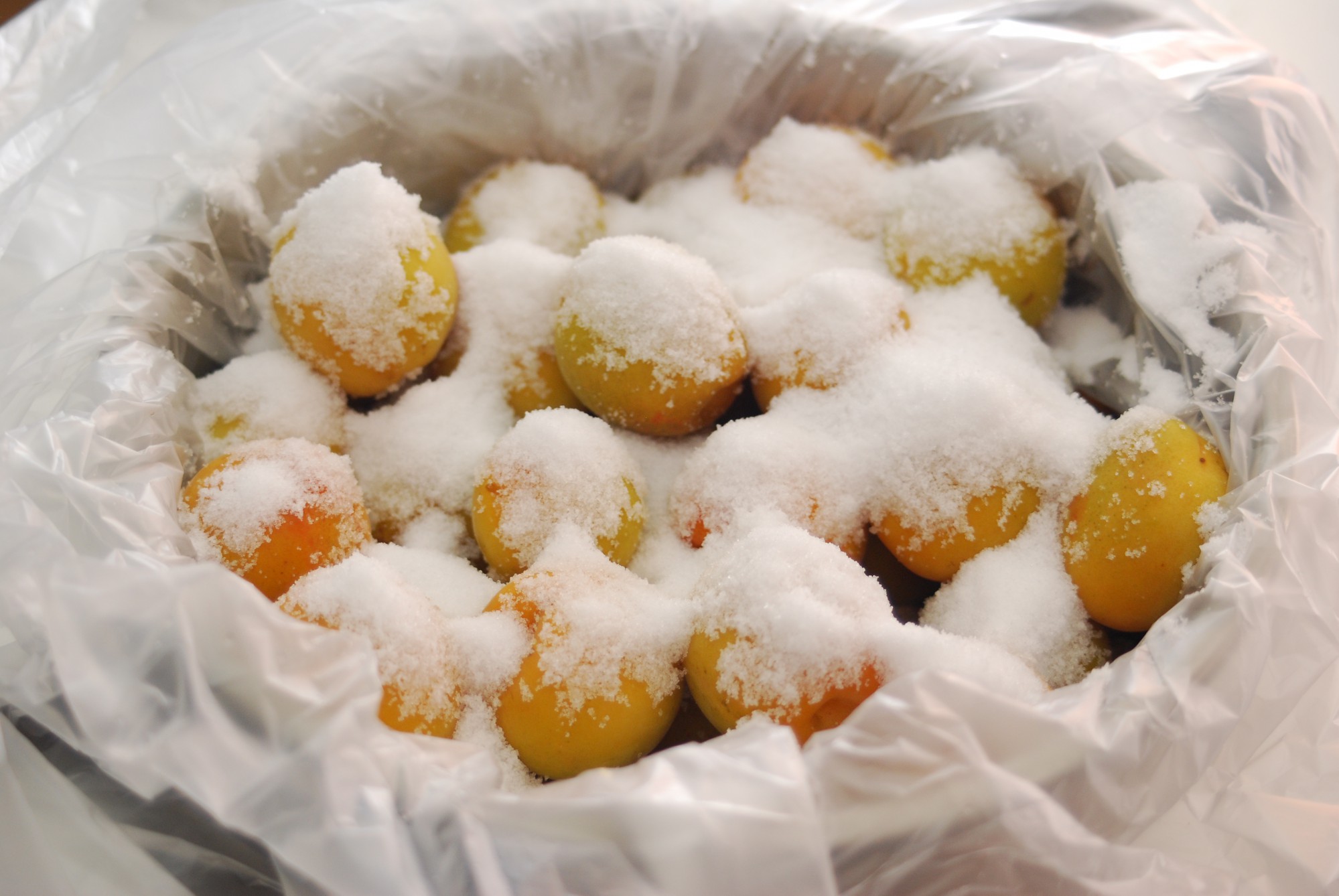 準備ができたら鍋に大きめのビニール袋を入れ、その中に梅を並べていきます。鍋底に梅を並べて軽く塩を振り、その上にさらに梅を並べて軽く塩を振り──といった具合に、梅の実と塩を交互に重ねていくイメージで鍋の中に梅を詰めていきましょう。