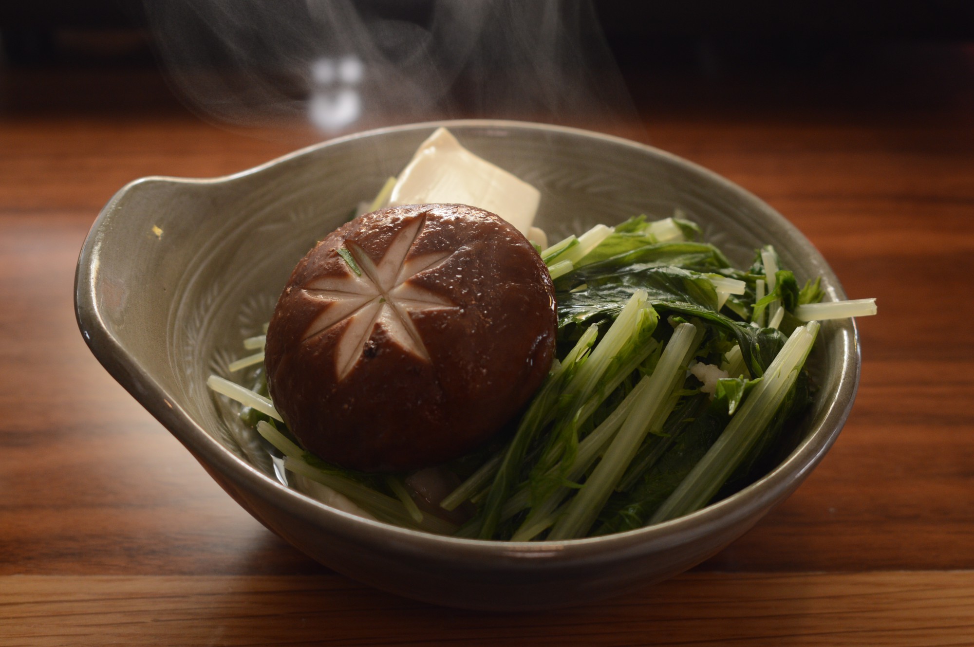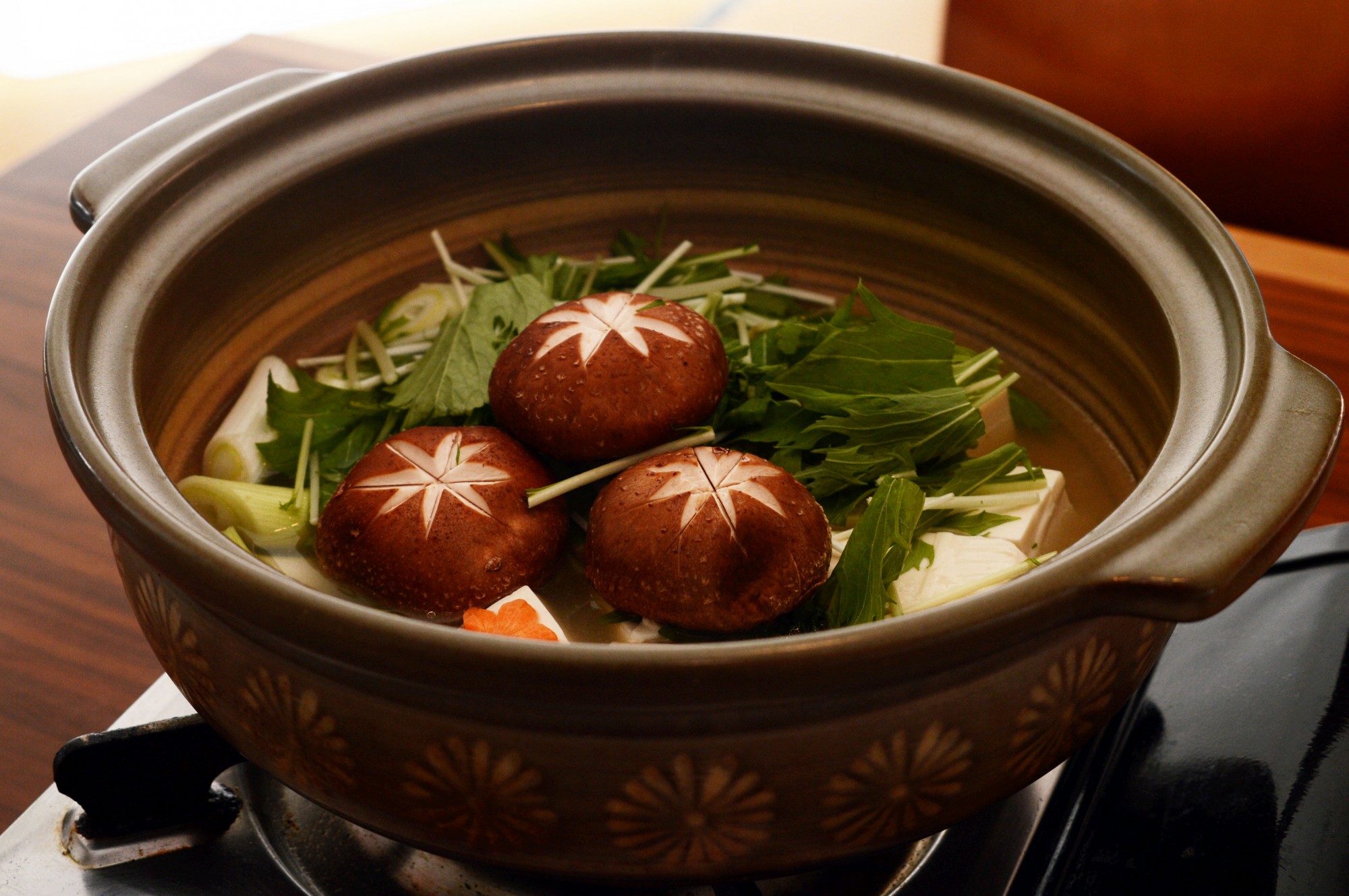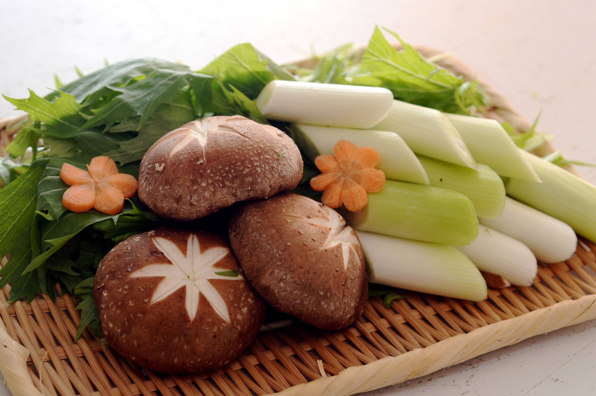 使用する野菜はそれぞれ食べやすいサイズ、形にカットしておきましょう。水菜は4cm程度の幅で切り、長ねぎは3cm幅の斜め切りに。しいたけに飾り切りをしておくと見た目にも華やかです。
