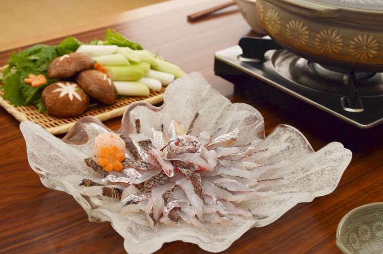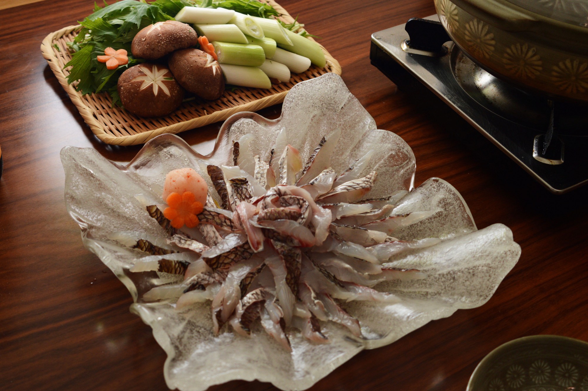 スープ、もみじおろし、各種野菜、鯛の刺身の用意ができたら、いよいよ鯛しゃぶを楽しめますよ。