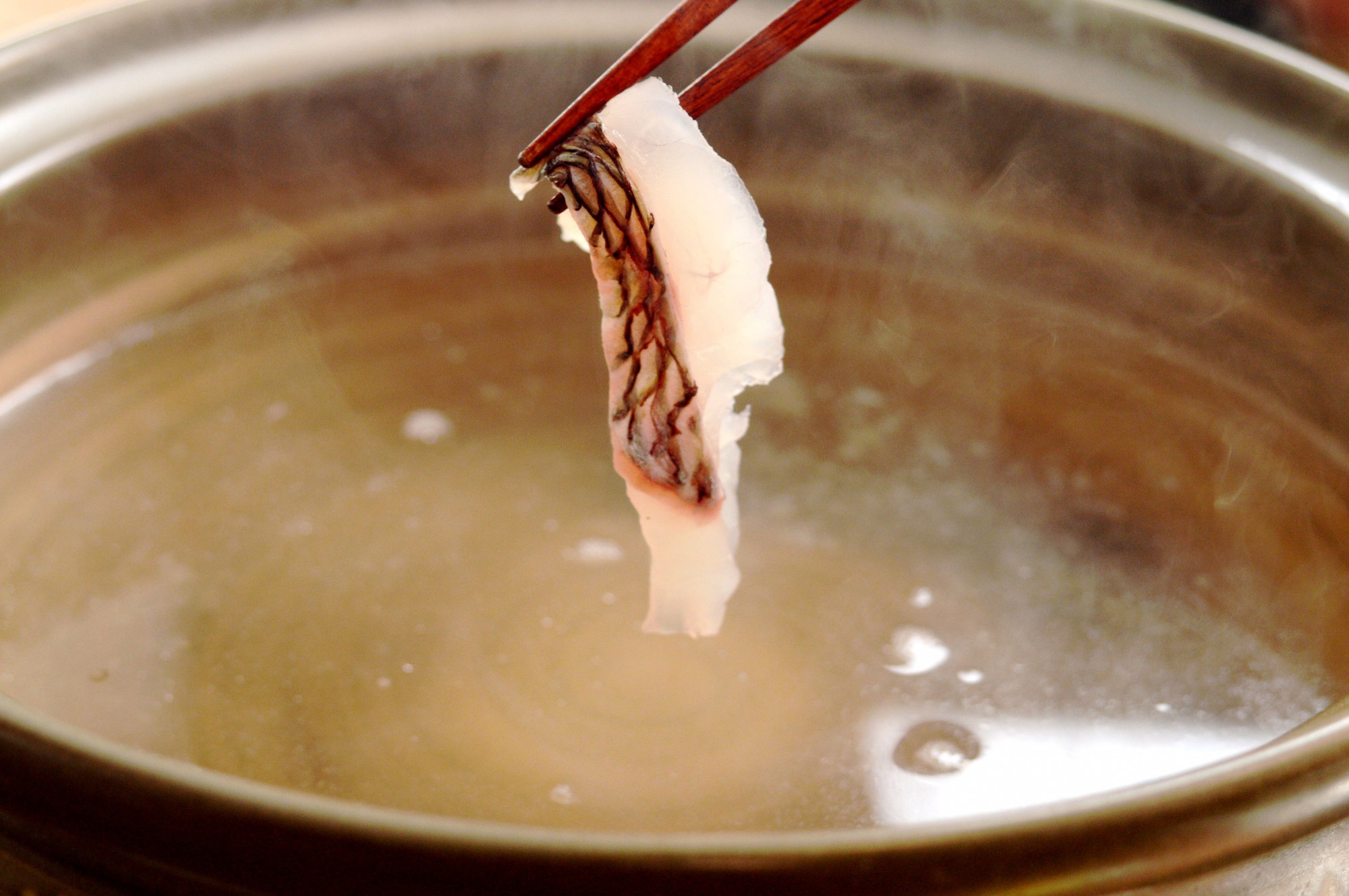 鯛の刺身は基本的に生で食べることもできます。むしろあまり火を入れすぎると、鯛のうまみがスープに逃げ出してしまうので、レアくらいを狙ってしゃぶしゃぶするのがポイント。