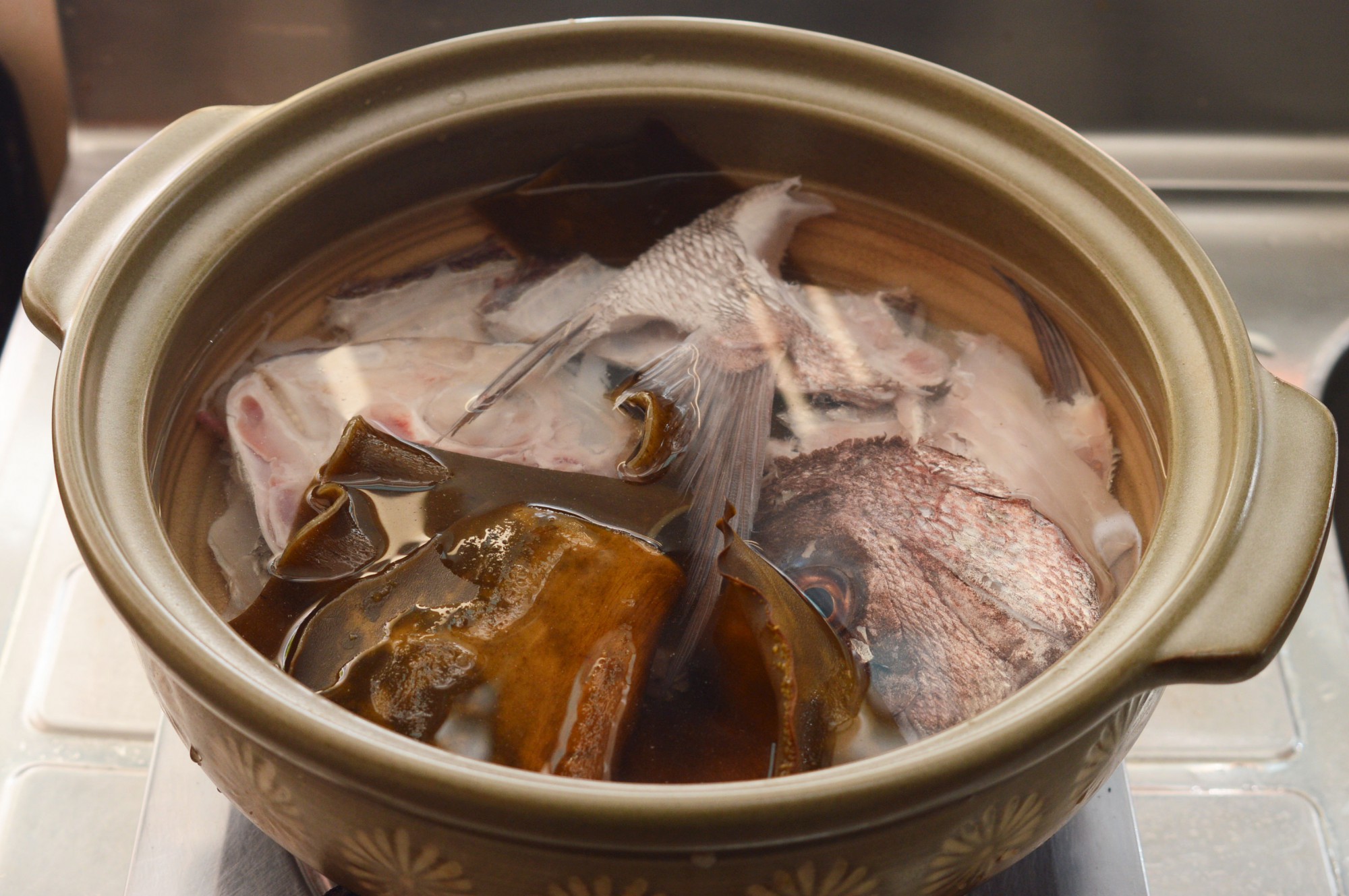 アラの血や汚れをしっかりと洗い落としたら、鍋に水と昆布、鯛のアラを入れて加熱します。ていねいにアクを取り、沸騰直前になったら昆布を取り出します。